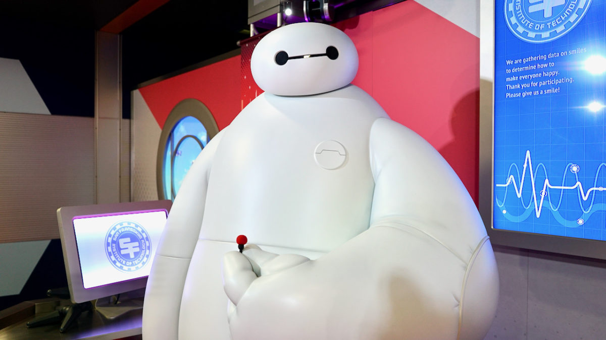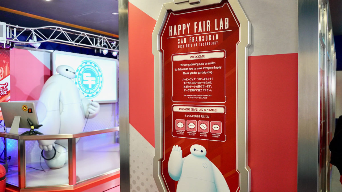 Baymax himself stands behind a counter, flanked by a screen with the San Fransokyo Institute of Technology logo and two “Happy Fair with Baymax” banners.