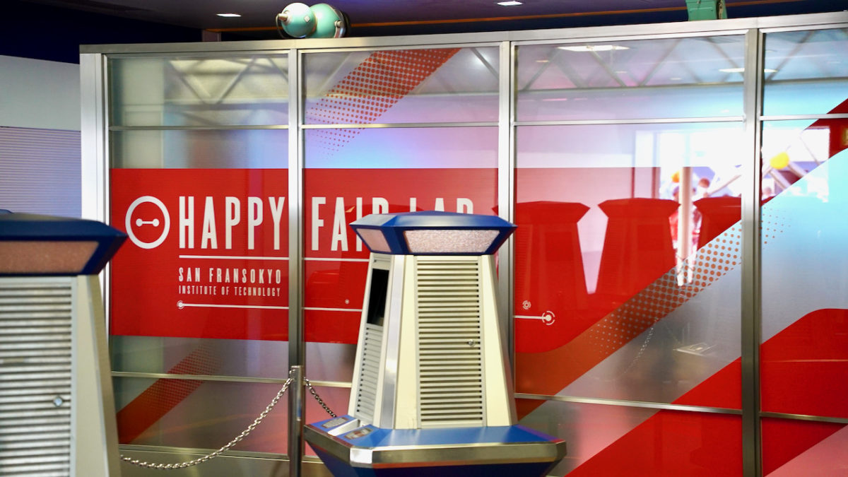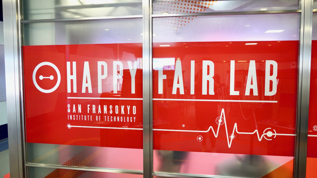 The wall text reads “Happy Fair Lab” subtitled by “San Fransokyo Institute of Technology”.