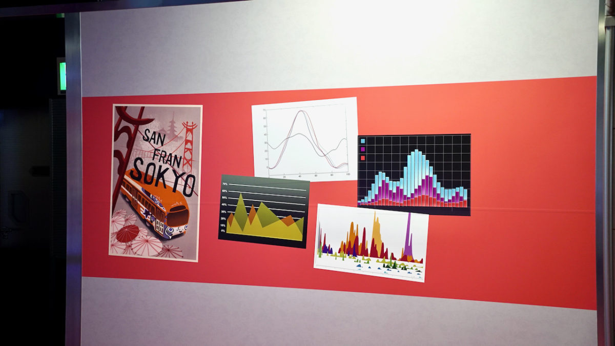 Assorted graphs and a neat ’50s-style travel poster adorn the walls next to Cast Members.