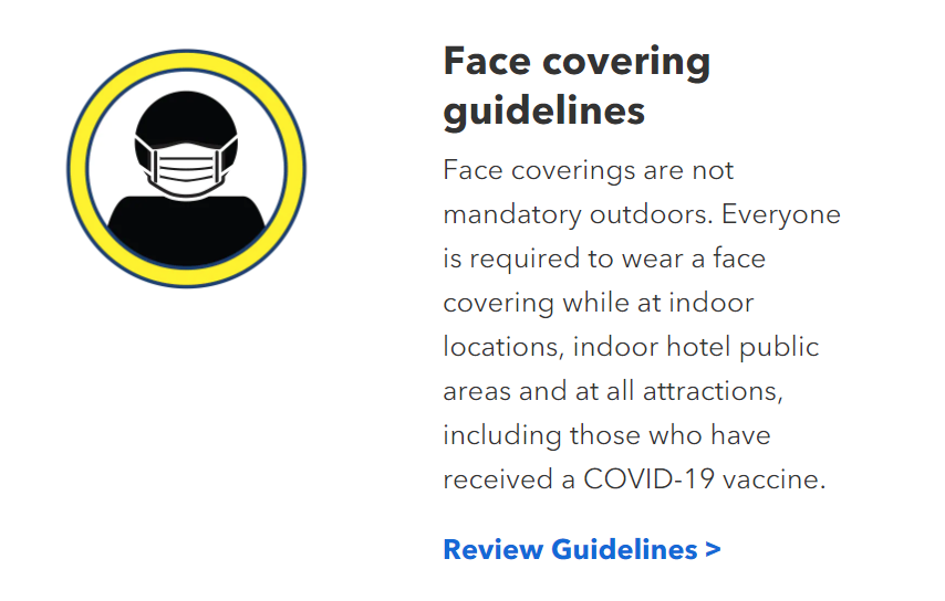 The resort has confirmed that masks will still be required at all indoor locations, as well as in attraction queues and while experiencing attractions, even if the queue or attraction is partially or completely outdoors. Three feet of physical distancing will continue to be required, a change which was put into effect only 8 days ago. The full, updated face covering policy is: