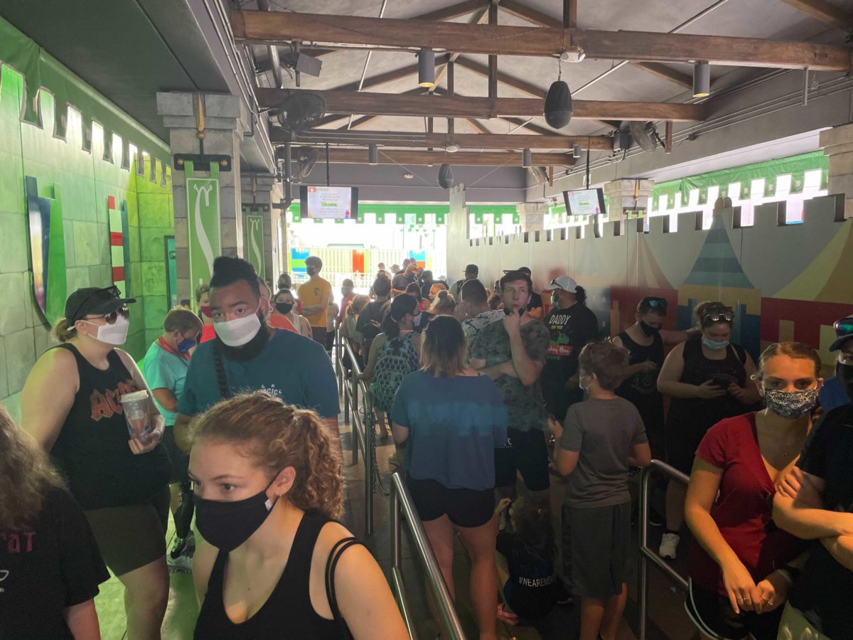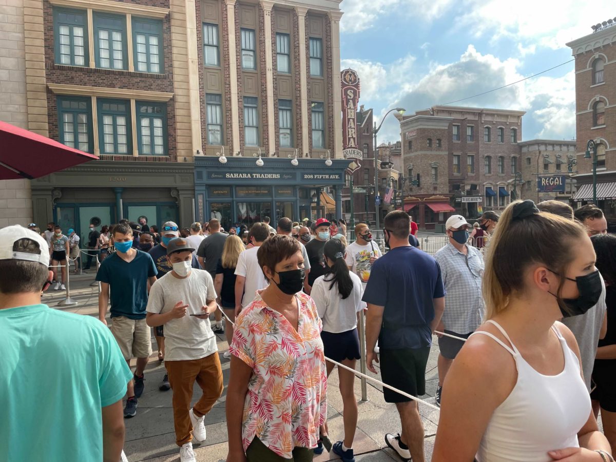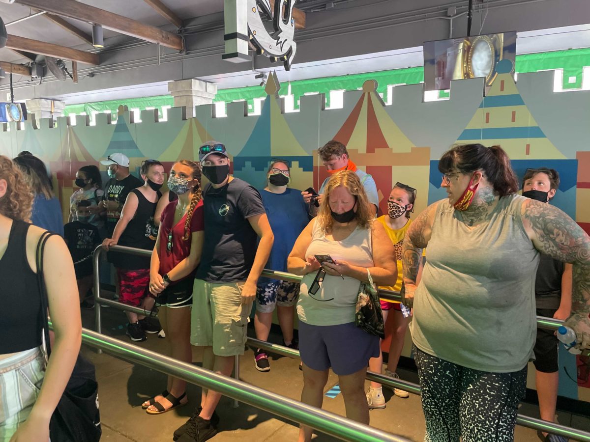 Face masks are still required, but it’s very hard to enforce the policy when people are waiting in long lines for attractions.