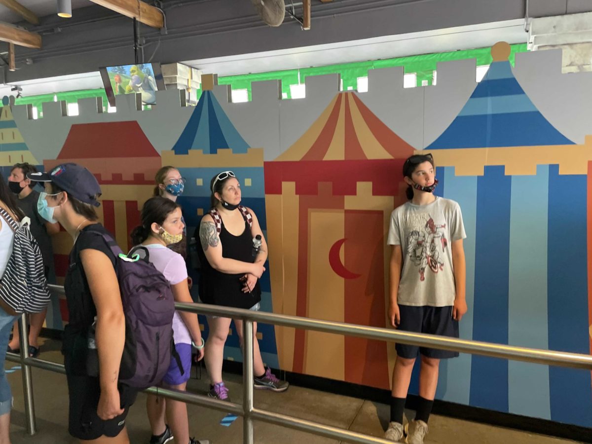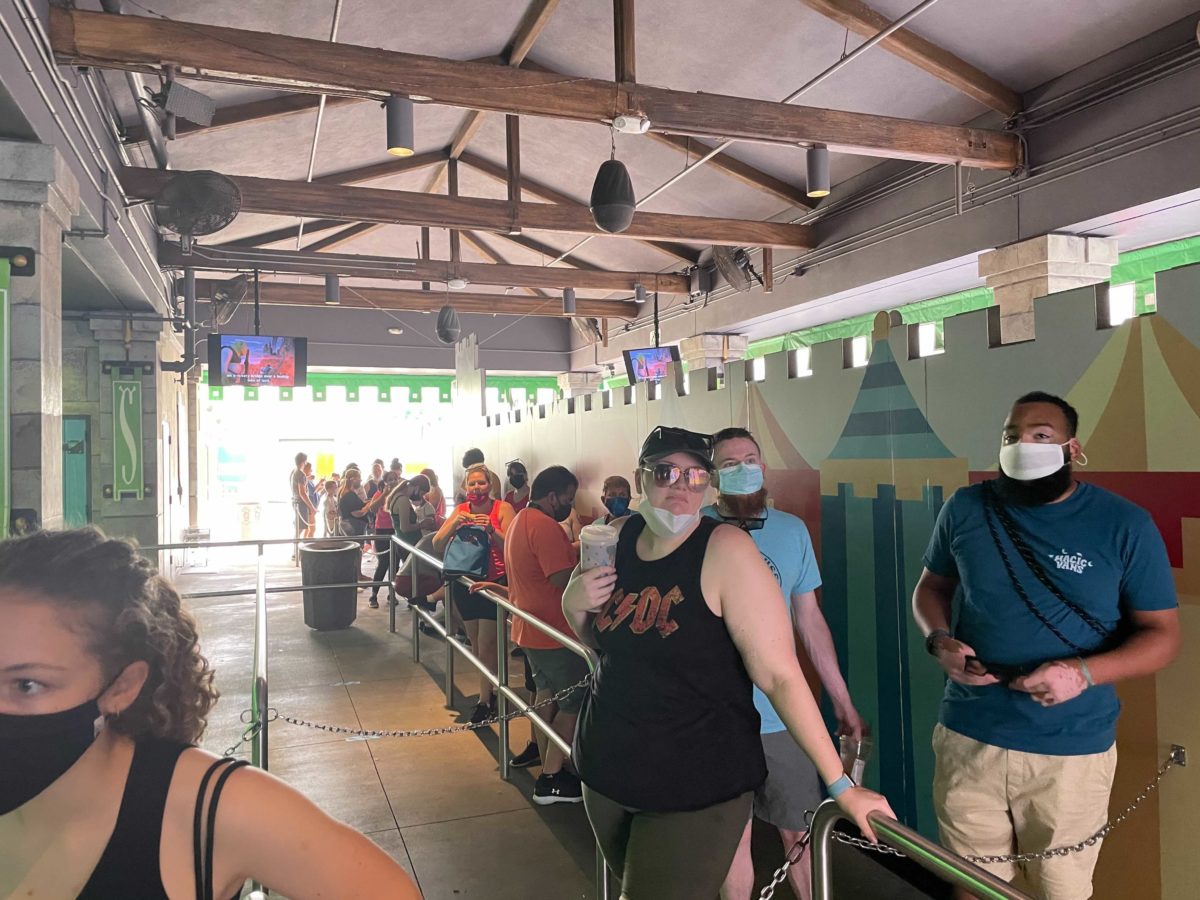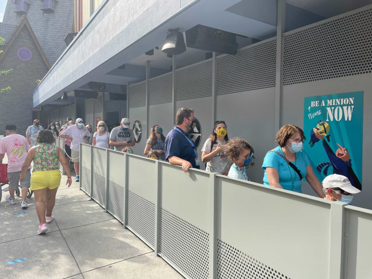 Face masks are still required, but it’s very hard to enforce the policy when people are waiting in long lines for attractions.