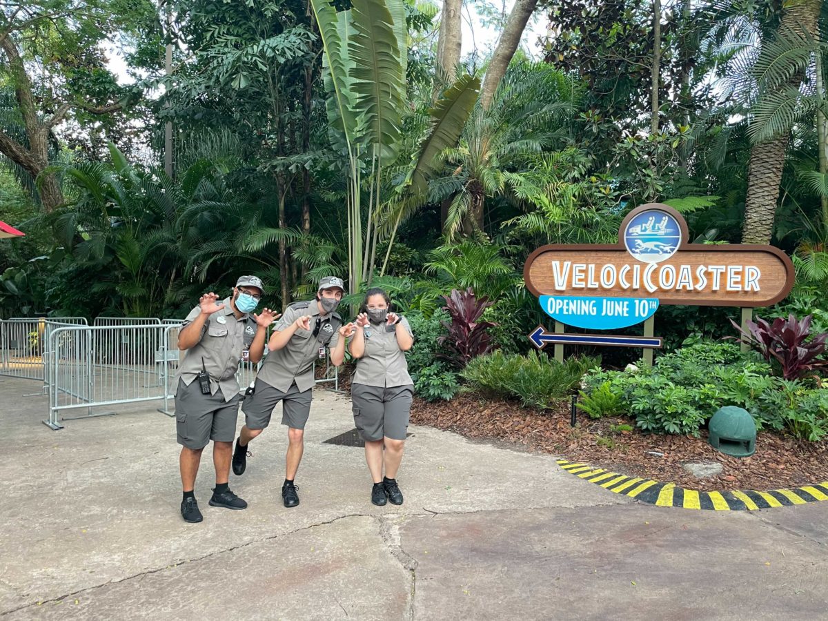 VelociCoaster Team Members were out around the pathway that leads to the entrance of the attraction. We were hoping for a soft opening, so we decided to have a little fun with the Team Members while we waited. Stand down!