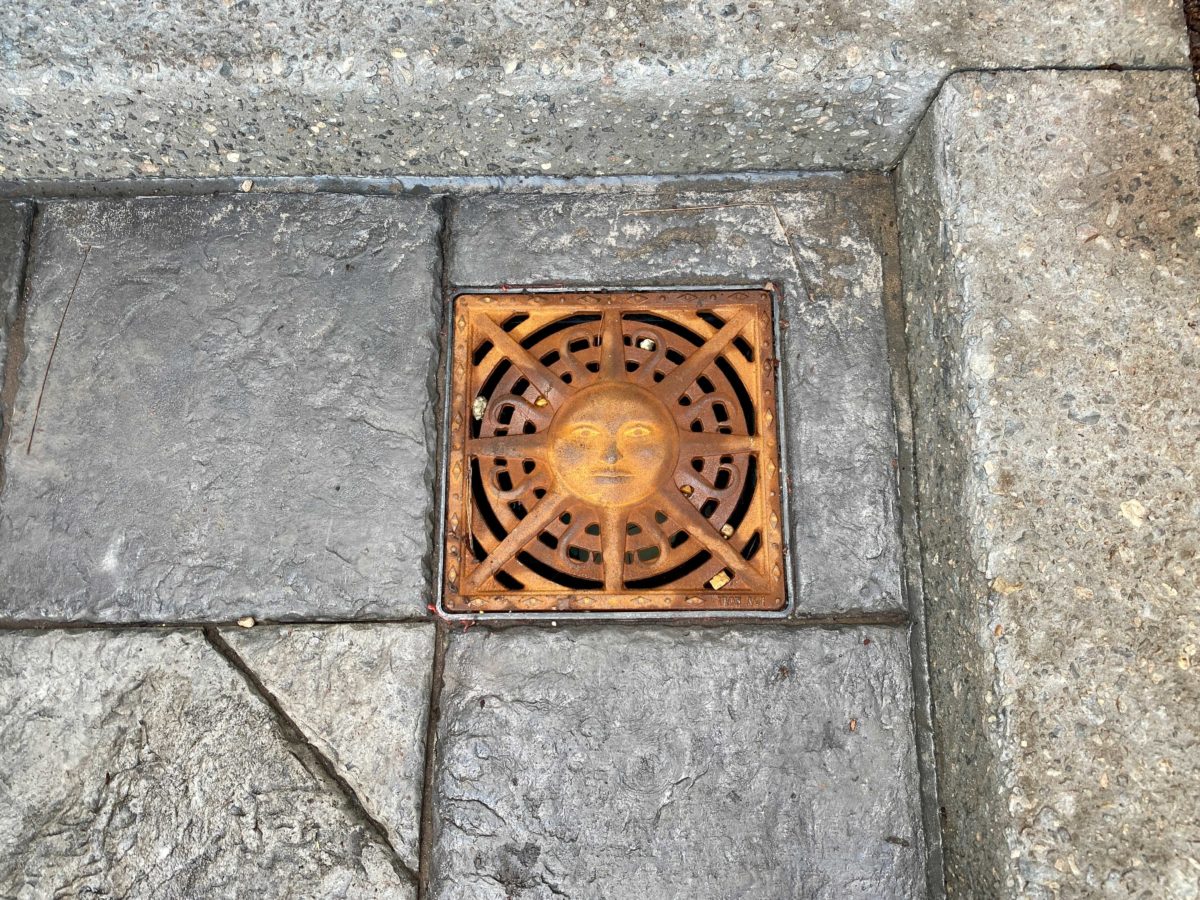 This grate in the queue had a cute sun face.