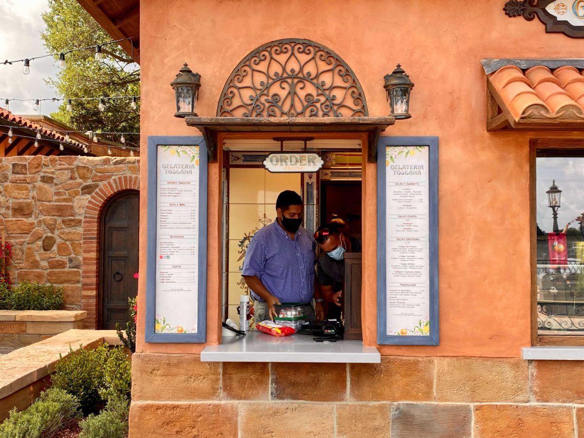 The walk-up kiosk is to the right of the Italy Pavilion’s Enoteca Costella, near the American Adventure Pavilion