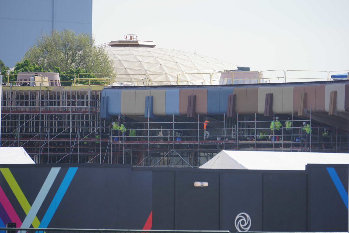 MouseGear is becoming the “Creations Shop” at EPCOT, and crew members have been hard at work bringing the new version of the store to life. Much of the exterior is currently covered in scaffolding as construction continues.