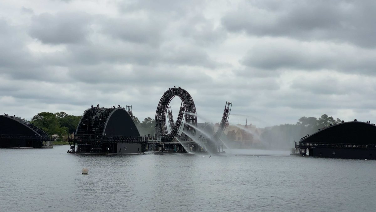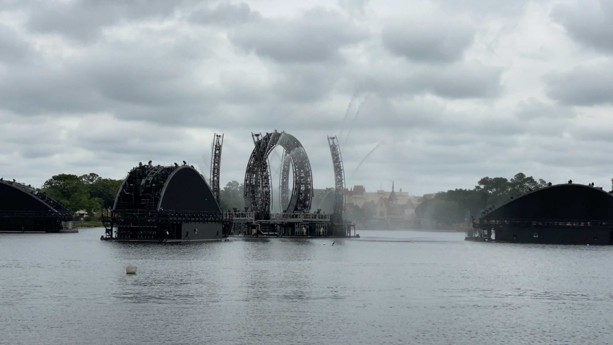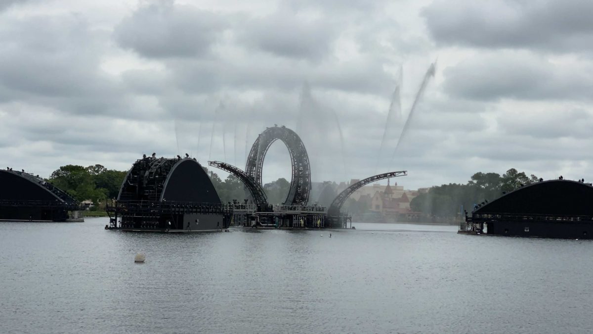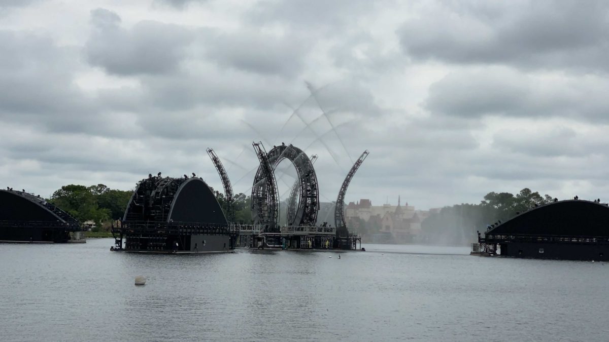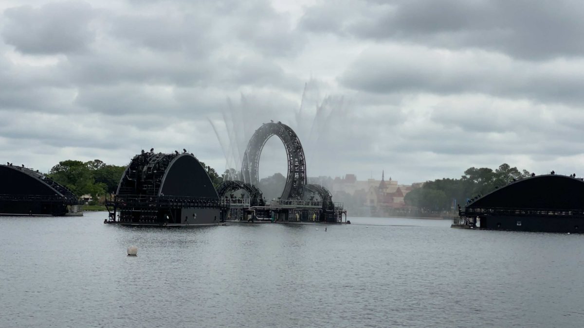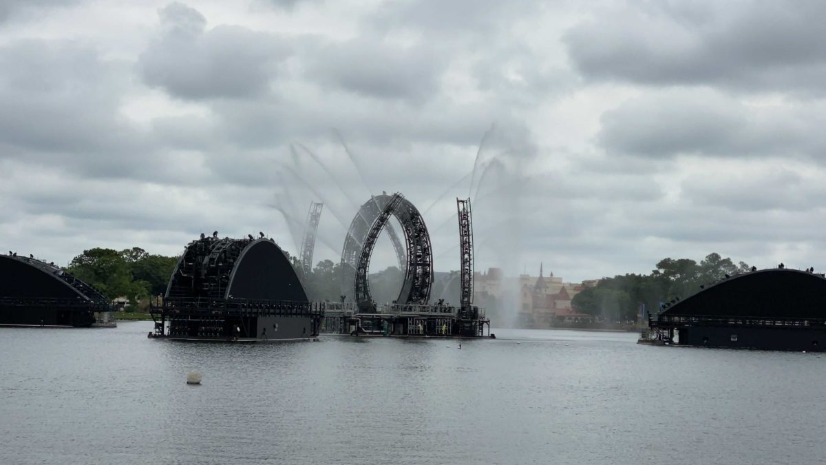 Today, we witnessed testing of the fountains that will become a permanent fixture in World Showcase Lagoon at EPCOT. These fountains are built into the barges for Harmonious, EPCOT’s upcoming nighttime spectacular.
