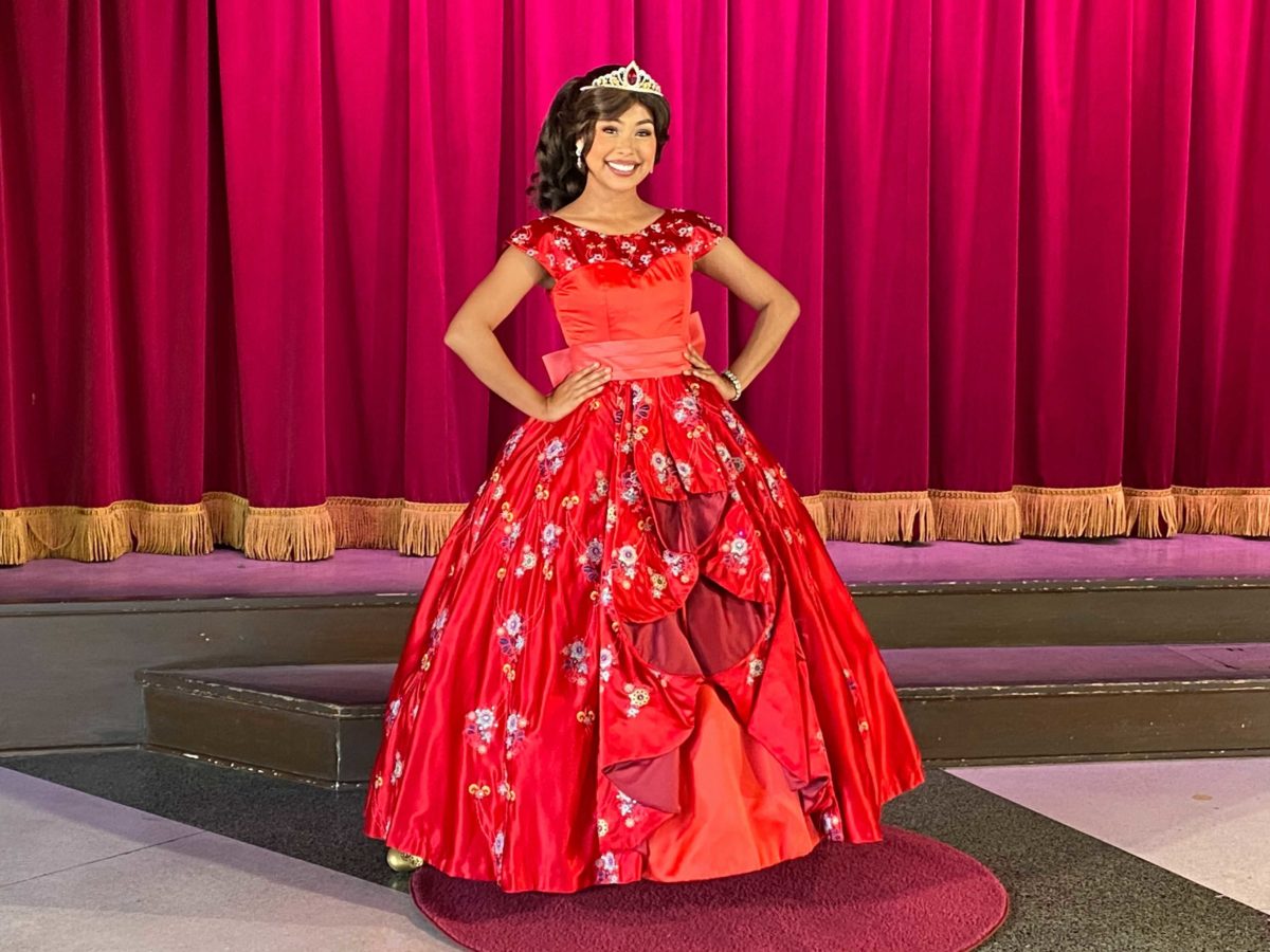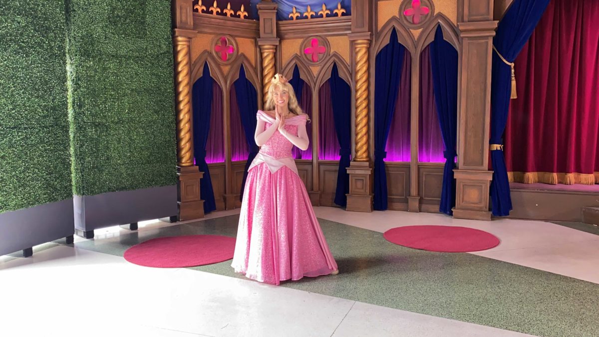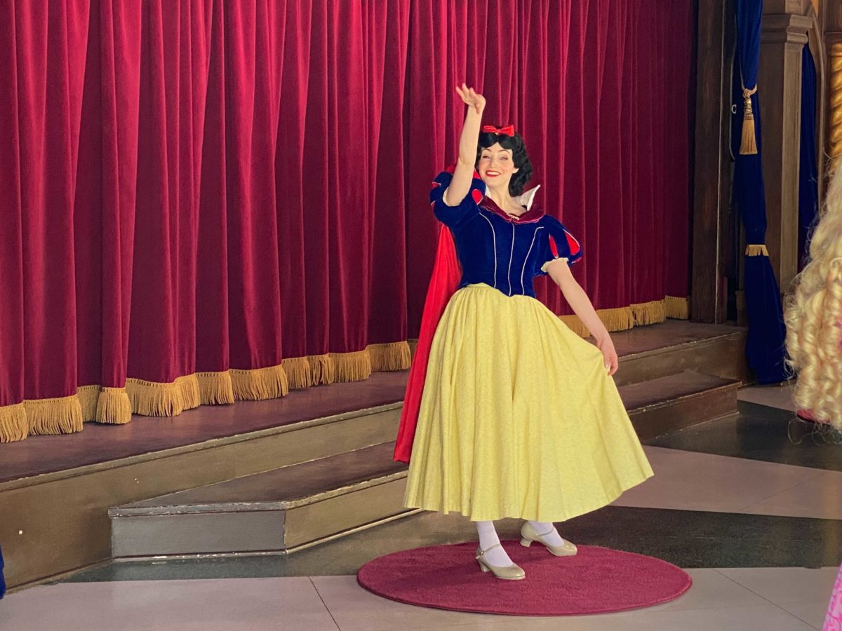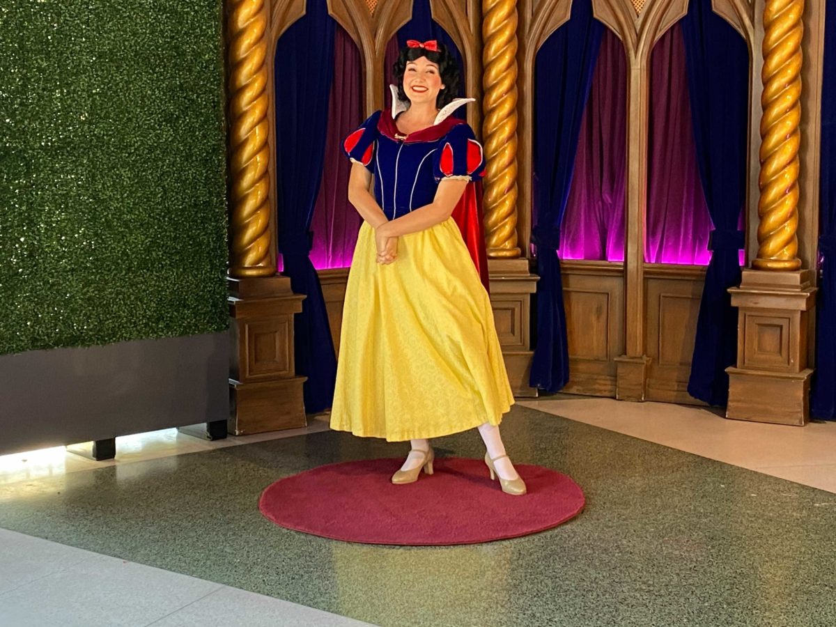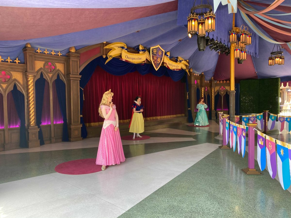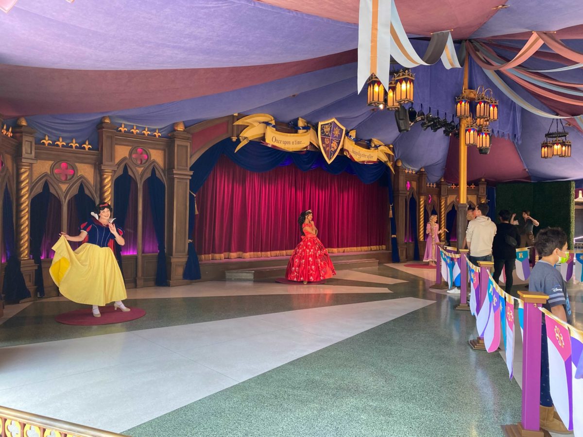 Snow White, Elena of Avalor, Rapunzel, Flynn Rider, Aurora, Ariel, Belle, and Cinderella alternate appearances inside the Royal Theatre.