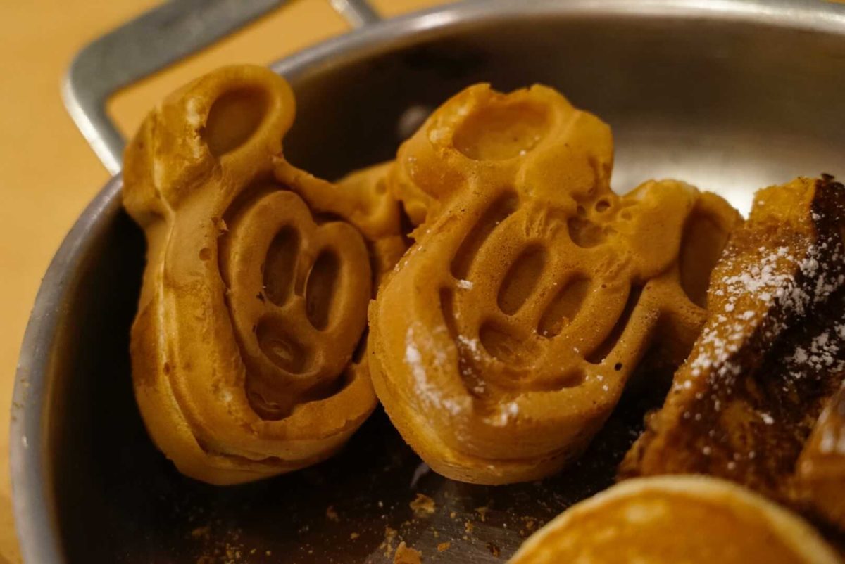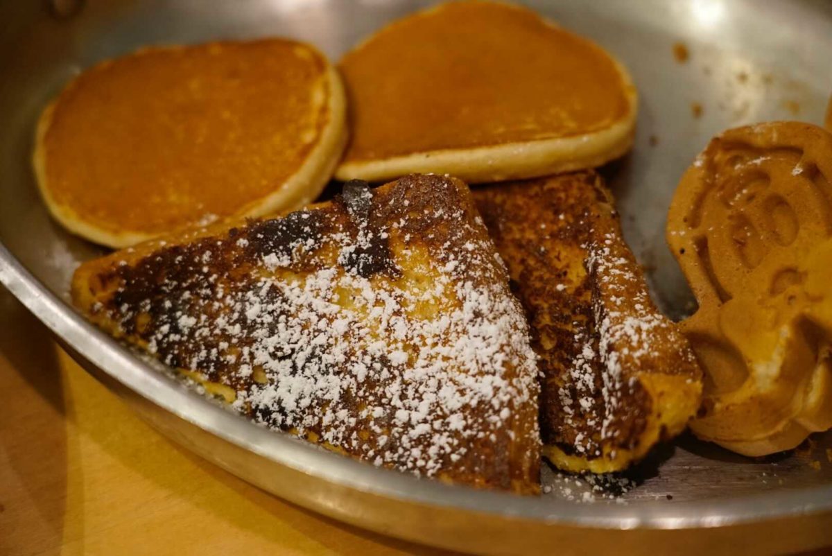 Mickey and Minnie Waffles, Seasonal Pancakes, Brioche French Toast, Cage-free Scrambled Eggs, Bacon, Breakfast Sausage, Crispy Potato Barrels, and Beef Hash