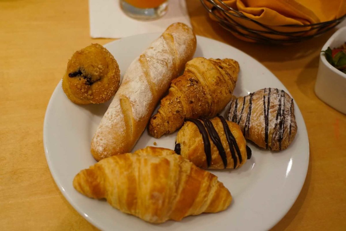 Croissant, Multigrain Croissant, French Rolls, “Lobster Tail” layered Crispy Pastry filled with Pastry Cream, Mini Muffins with Butter, Jelly, and Chocolate-Hazelnut Spread