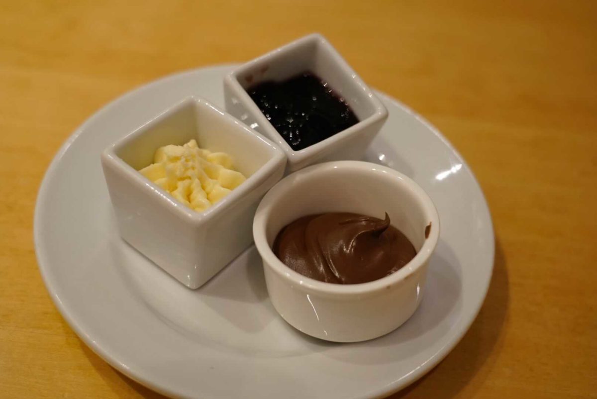 Condiments include honey butter, jelly, and a hazelnut spread. All of the other pastries were quite good, especially with some of these applied to them.