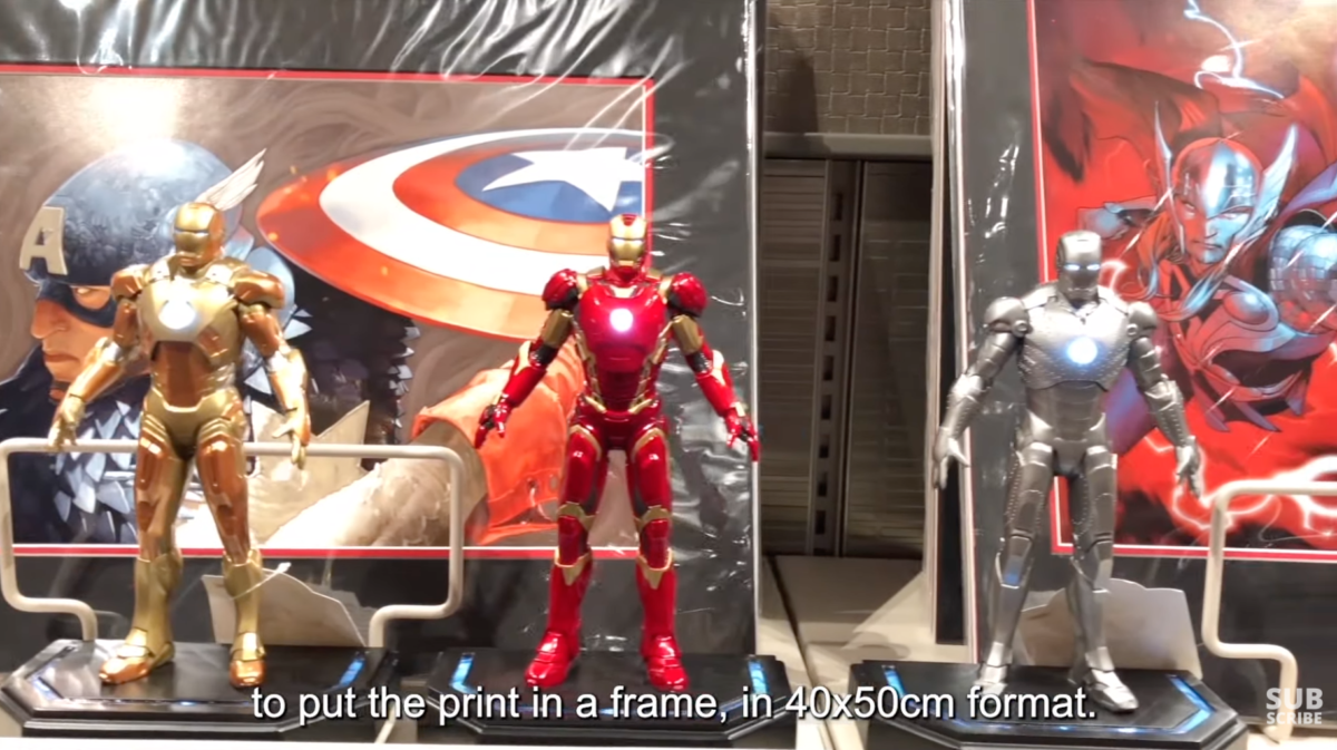Each Iron Man armor has been made into a collectible figure. The arc reactors light up.