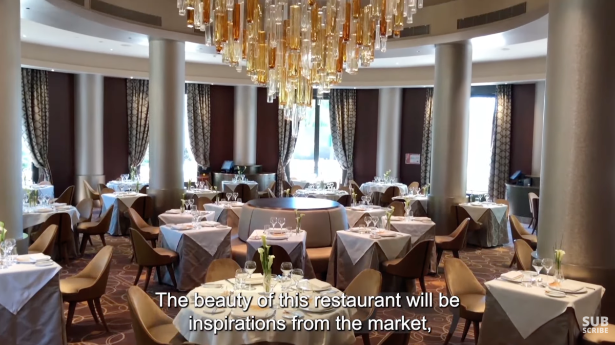 The Manhattan Restaurant dining room features an impressive Asgardian chandelier.