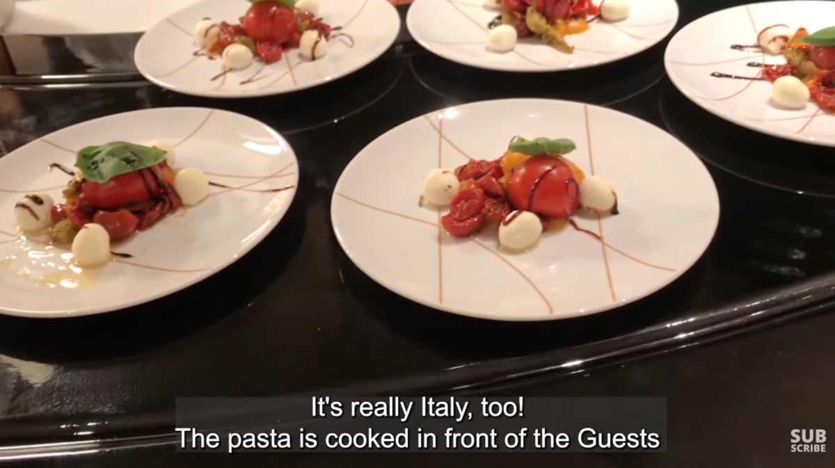 Some dishes are prepared by the chefs, plated, and placed on the buffet.