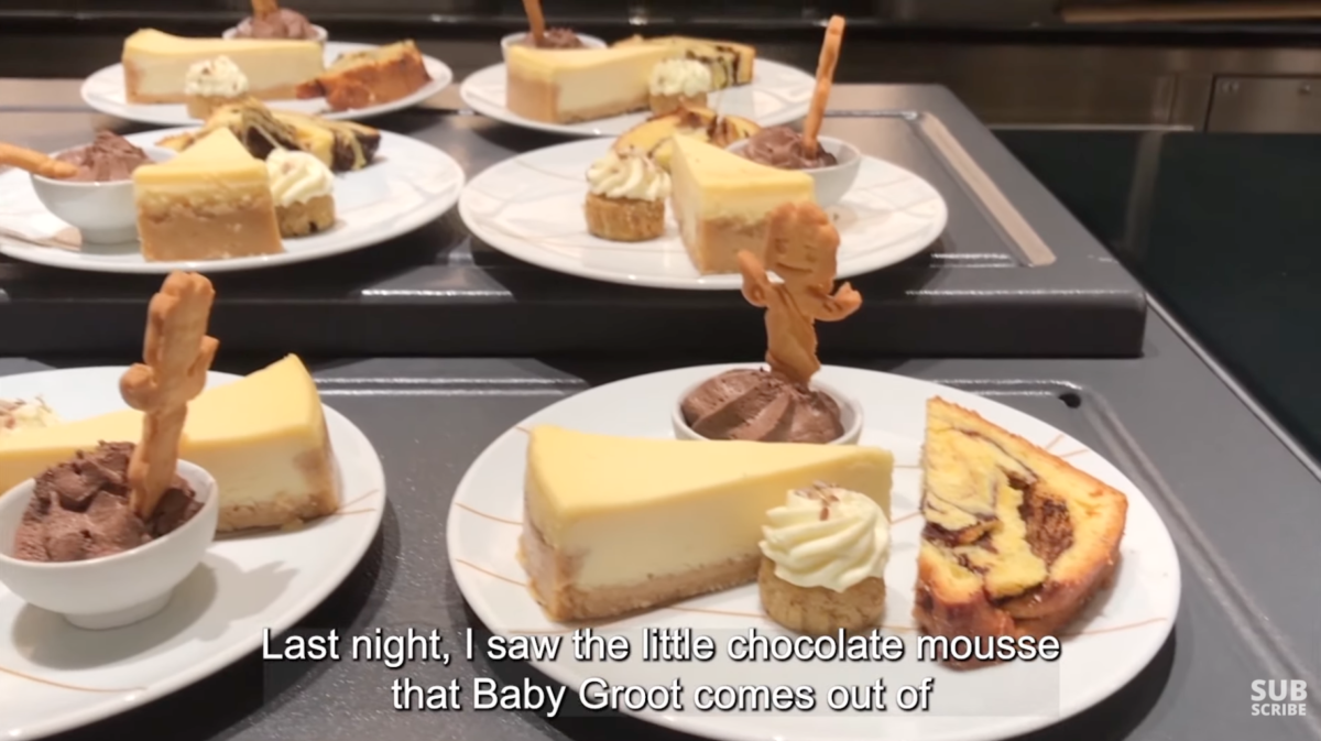 This dessert plate has a cookie baby Groot planted in a dish of chocolate mousse.