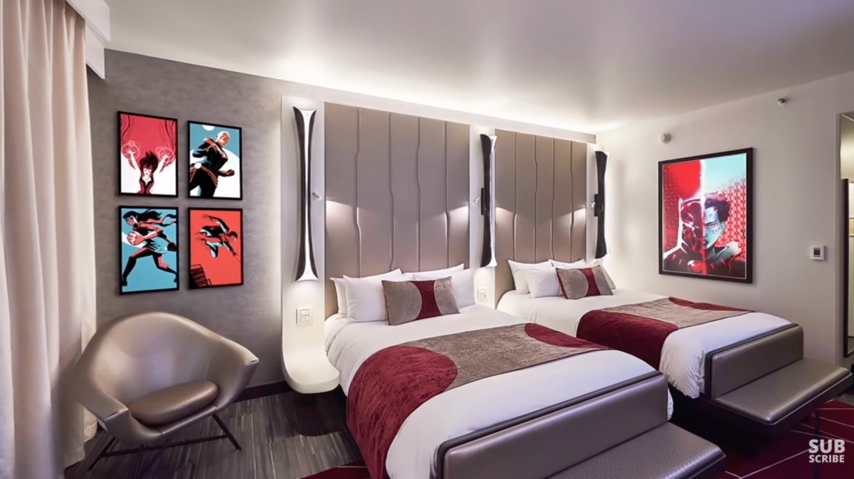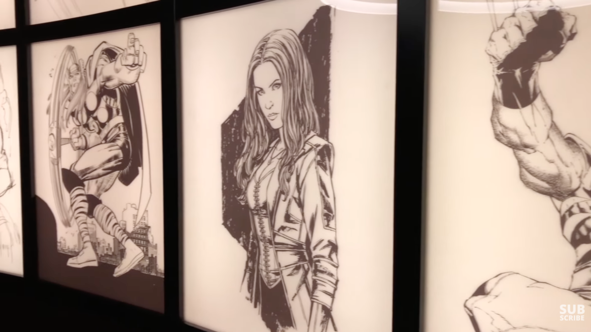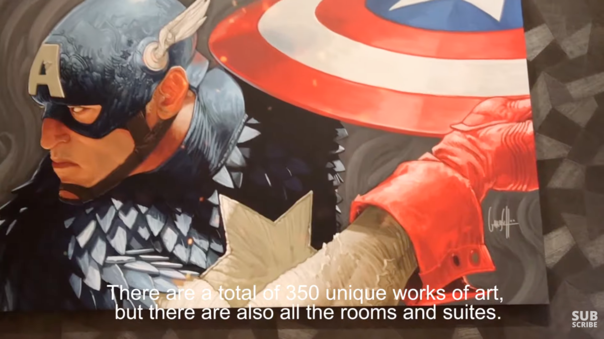 The largest piece of art is the illuminated comic book that greets guests as they enter the lobby.