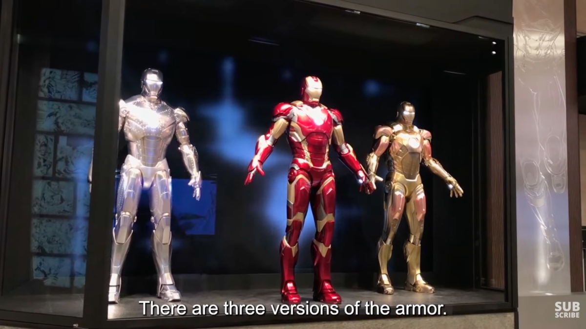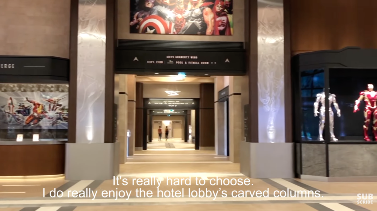 The Disney’s Hotel New York — The Art of Marvel lobby features three Iron Man armors.