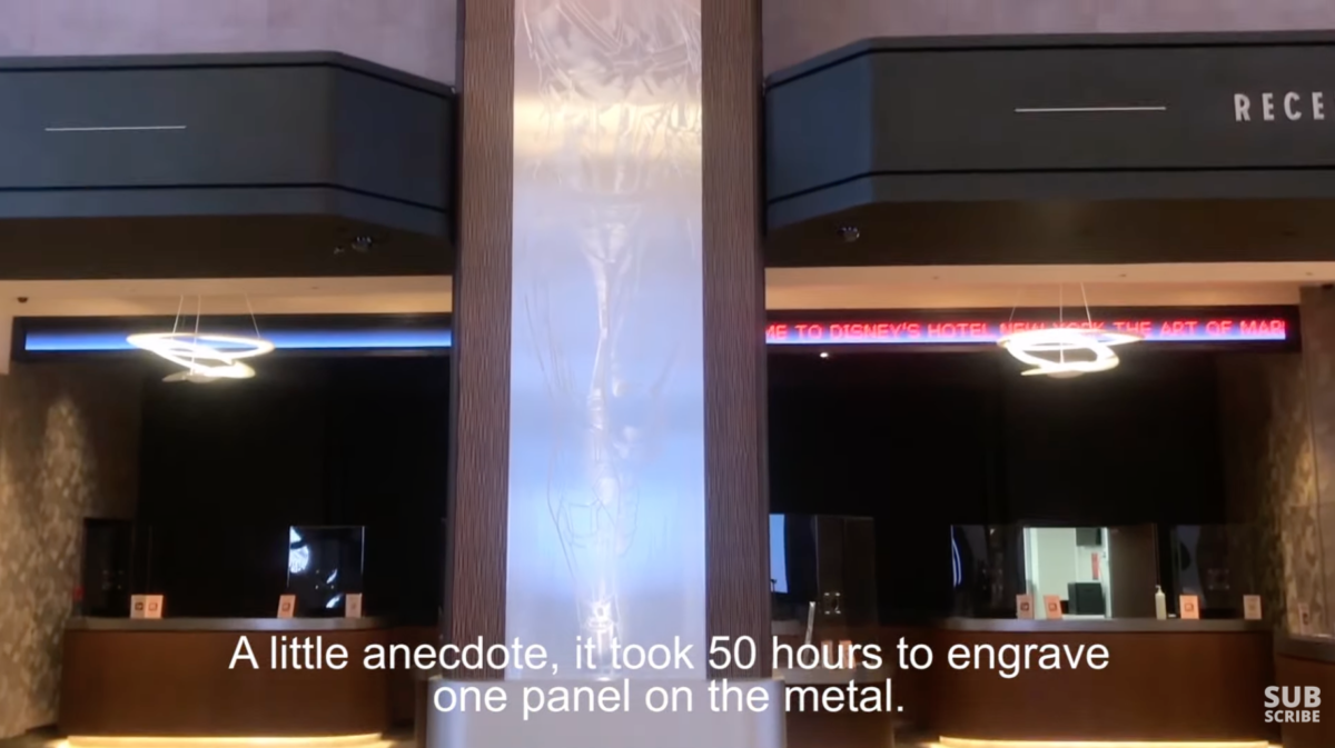 The lobby’s columns have engraved metal panels. Each panel took 50 hours to engrave.