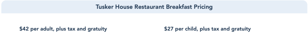 A peek at the menu on DisneyWorld.com shows that Breakfast will run $42 for adults and $27 for children.