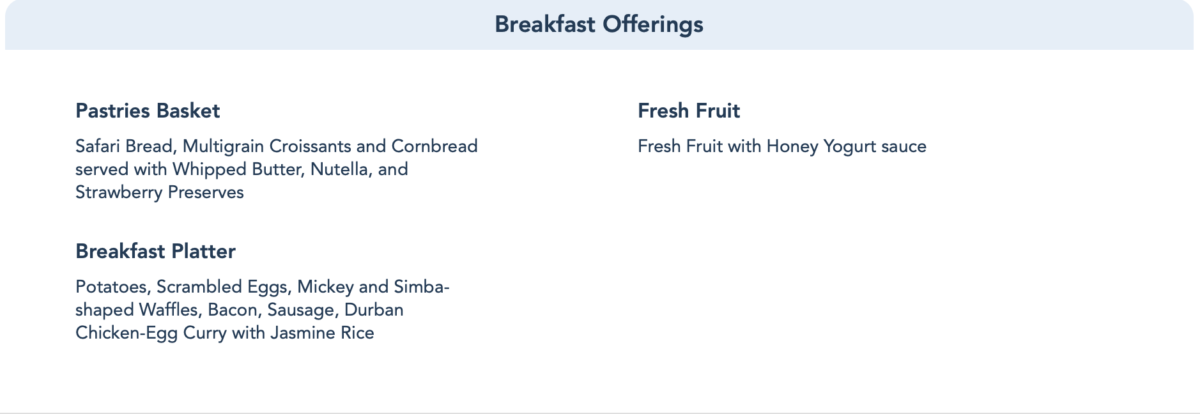 The family style breakfast includes a basket with assorted pastries, fresh fruit and a breakfast platter. Exciting options include Simba shaped waffles in addition to the usual Mickey waffles and an egg curry.