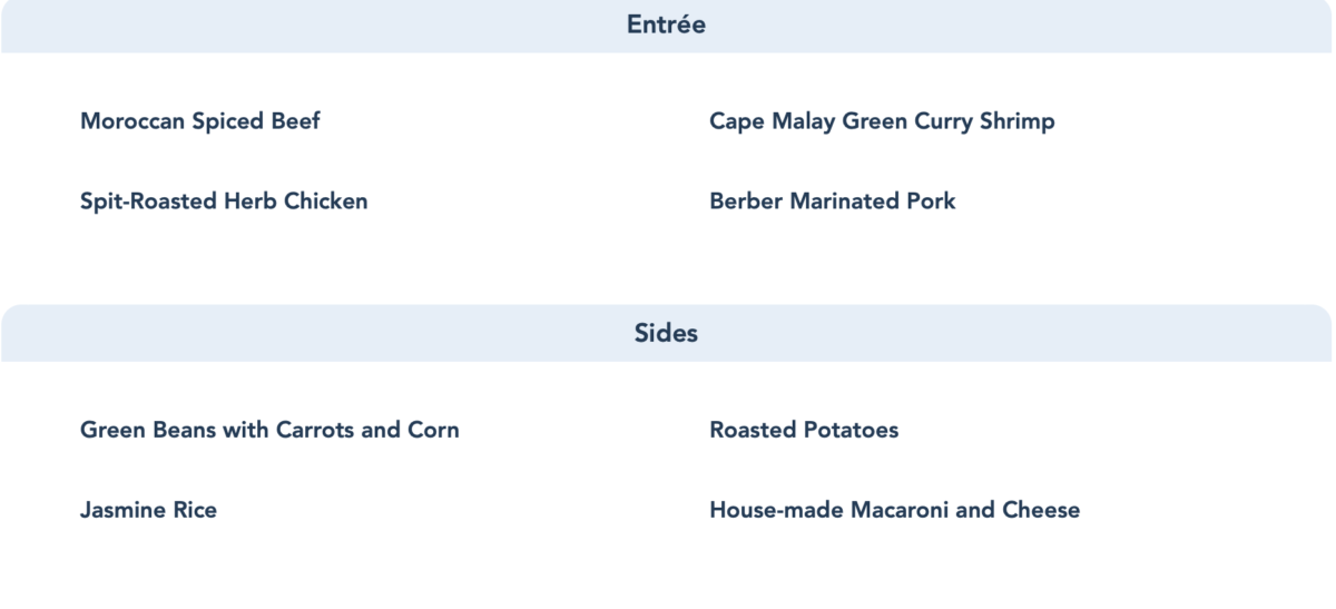 Entrees include Moroccan Spiced Beef, Spit Roasted Herb Chicken, a Green Curry Shrimp and Marinated Pork. These can be paired with a variety of sides ranging from veggies, rice and a house-made macaroni and cheese.