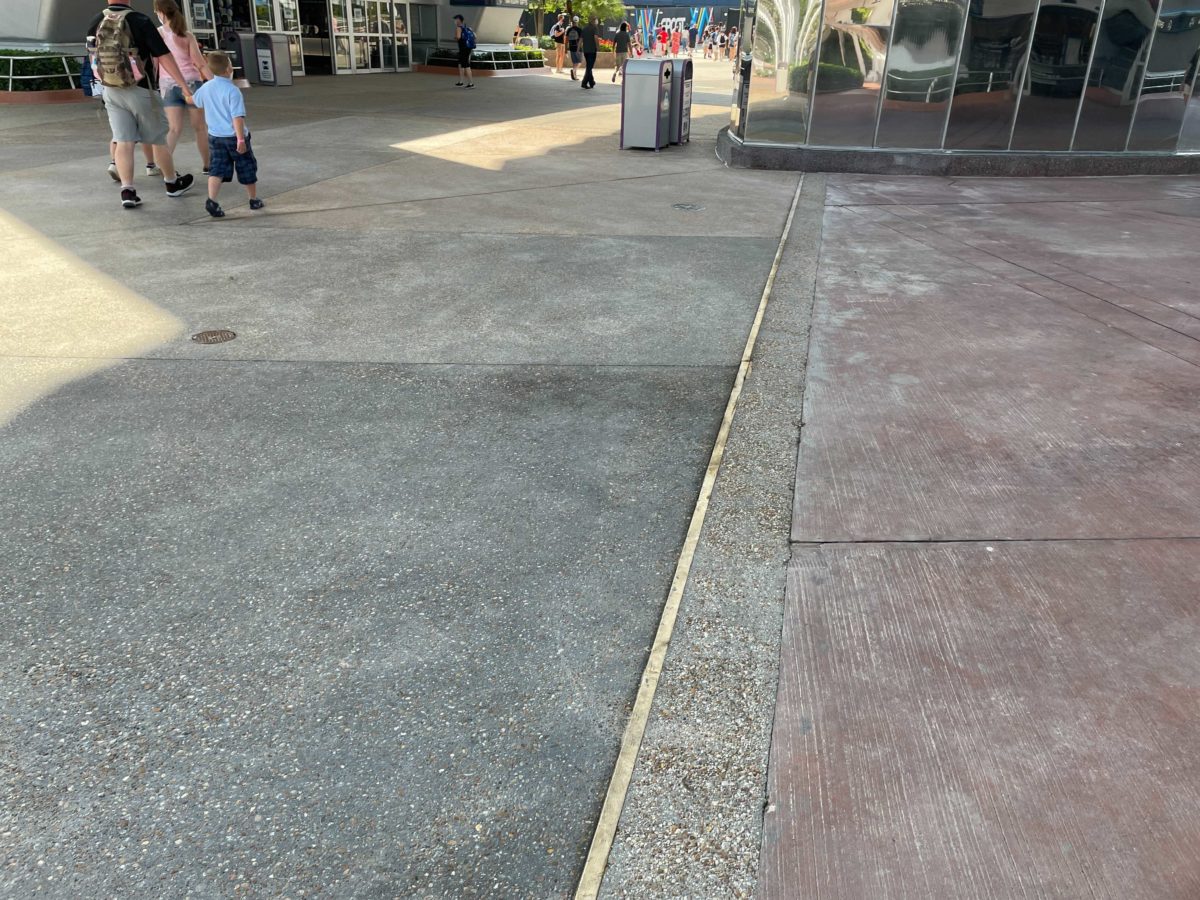 Above is a recent photo from near Spaceship Earth where the new speckled gray pavement can be seen. The red-toned pavement is being removed section by section as the work continues.