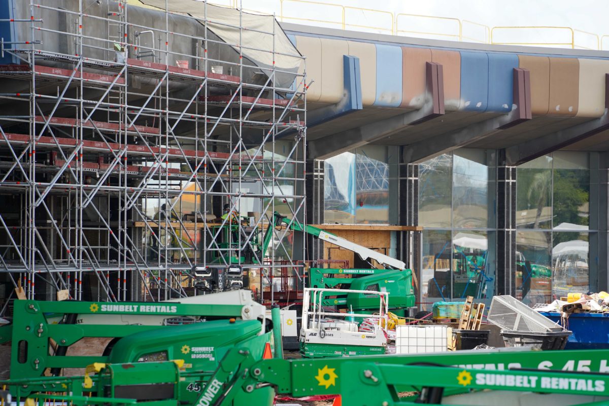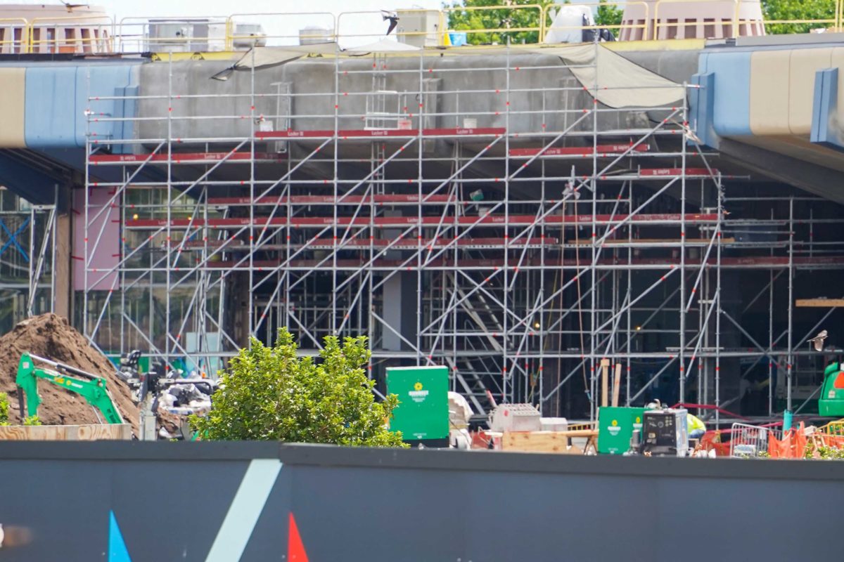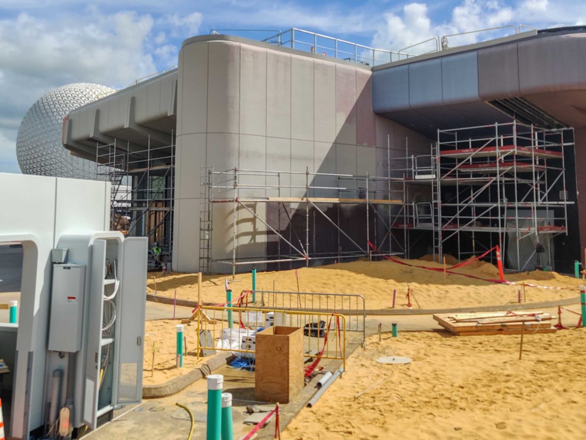Exterior painting has begun on the Creations Shop. The retail location is coming this summer to the former home of Mouse Gear. Imagineer Zach Riddley gave a sneak peek of the paint colors just two days ago. A new façade has also been constructed above the breezeway.