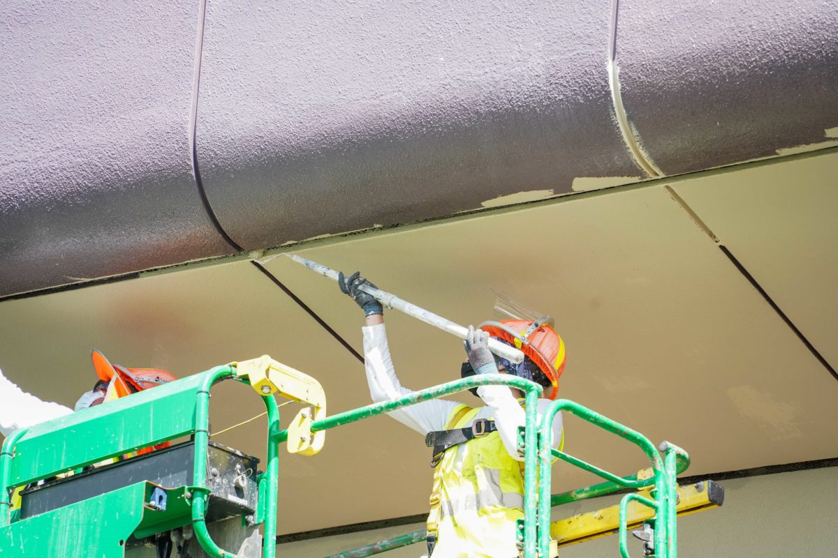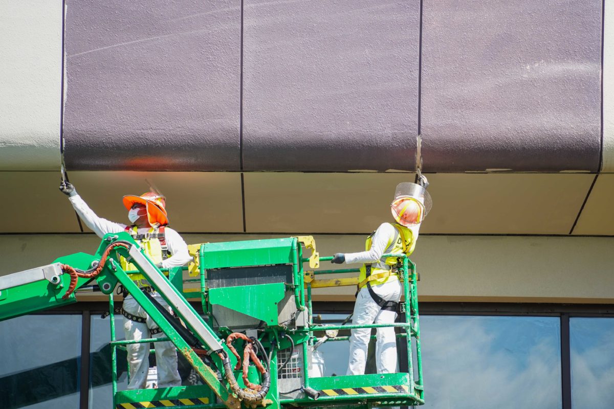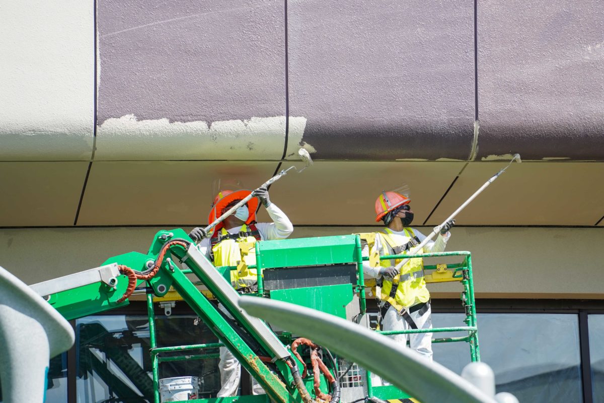 Paint crews are using small rollers to paint the gaps between the façade panels.