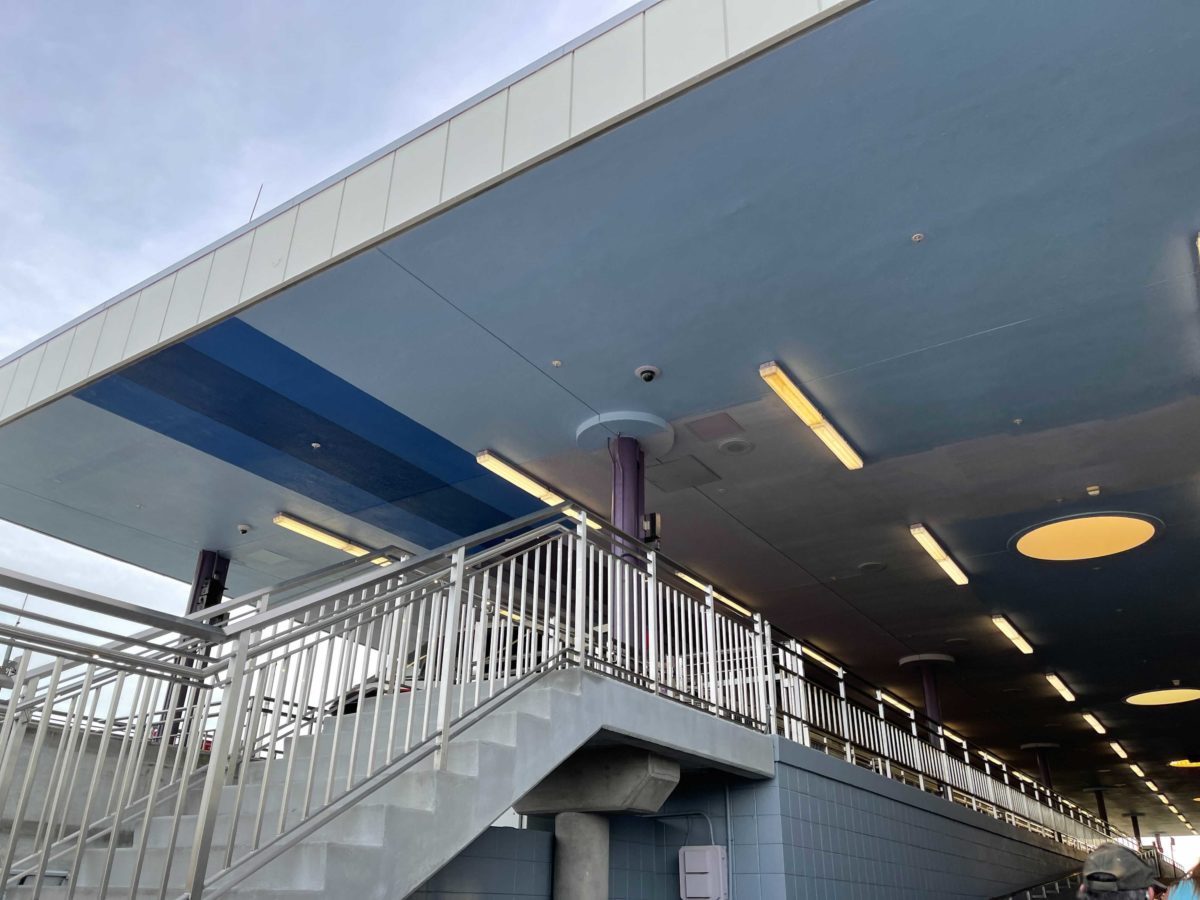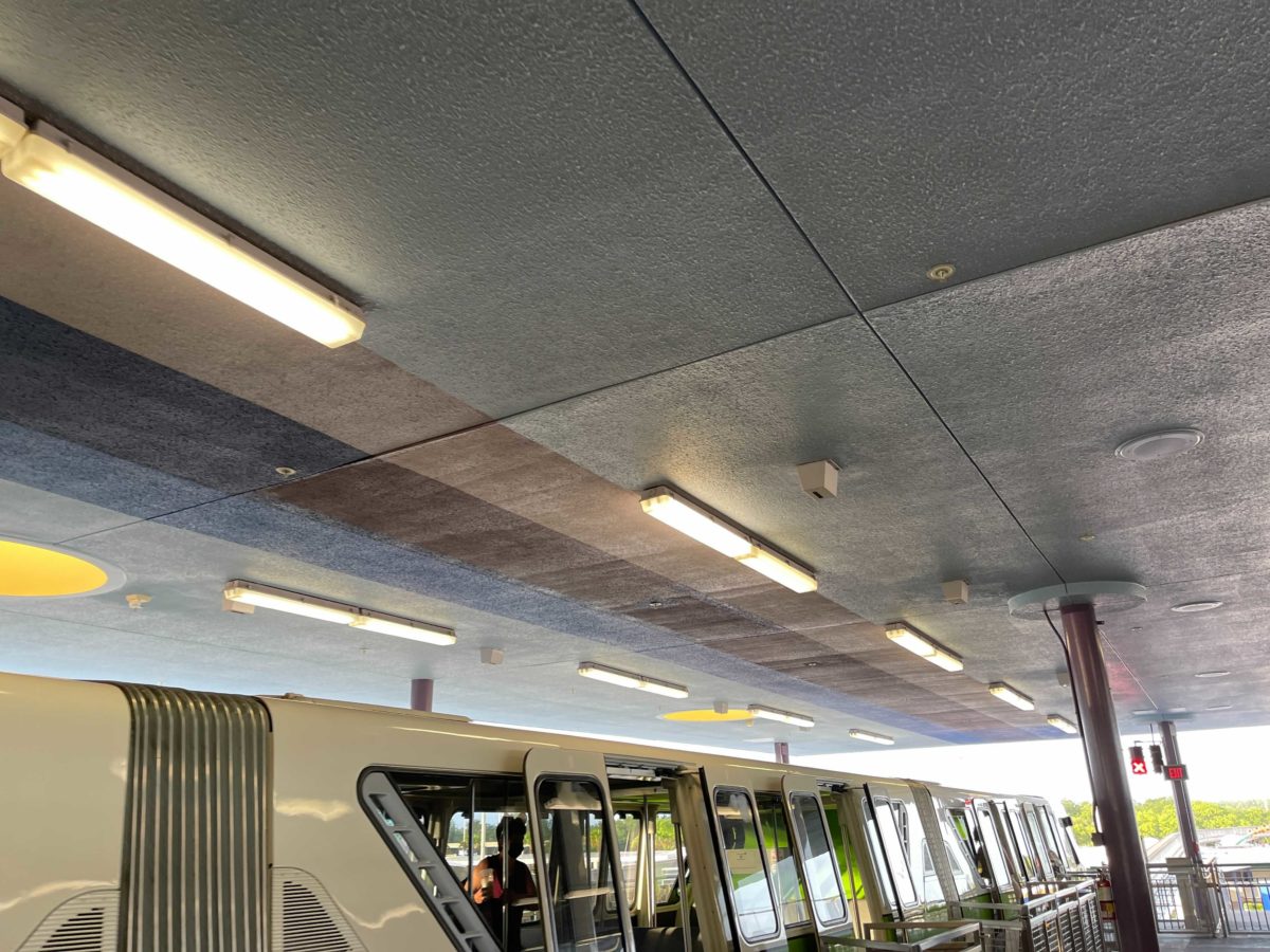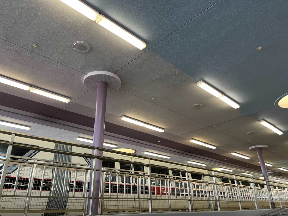 Much of the station has a new gray color, as seen beneath the monorail beam. The same color can be found on the loading platforms.