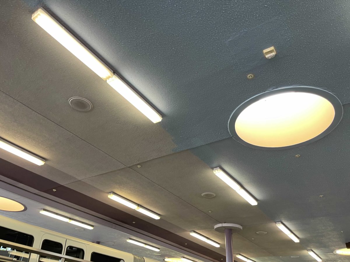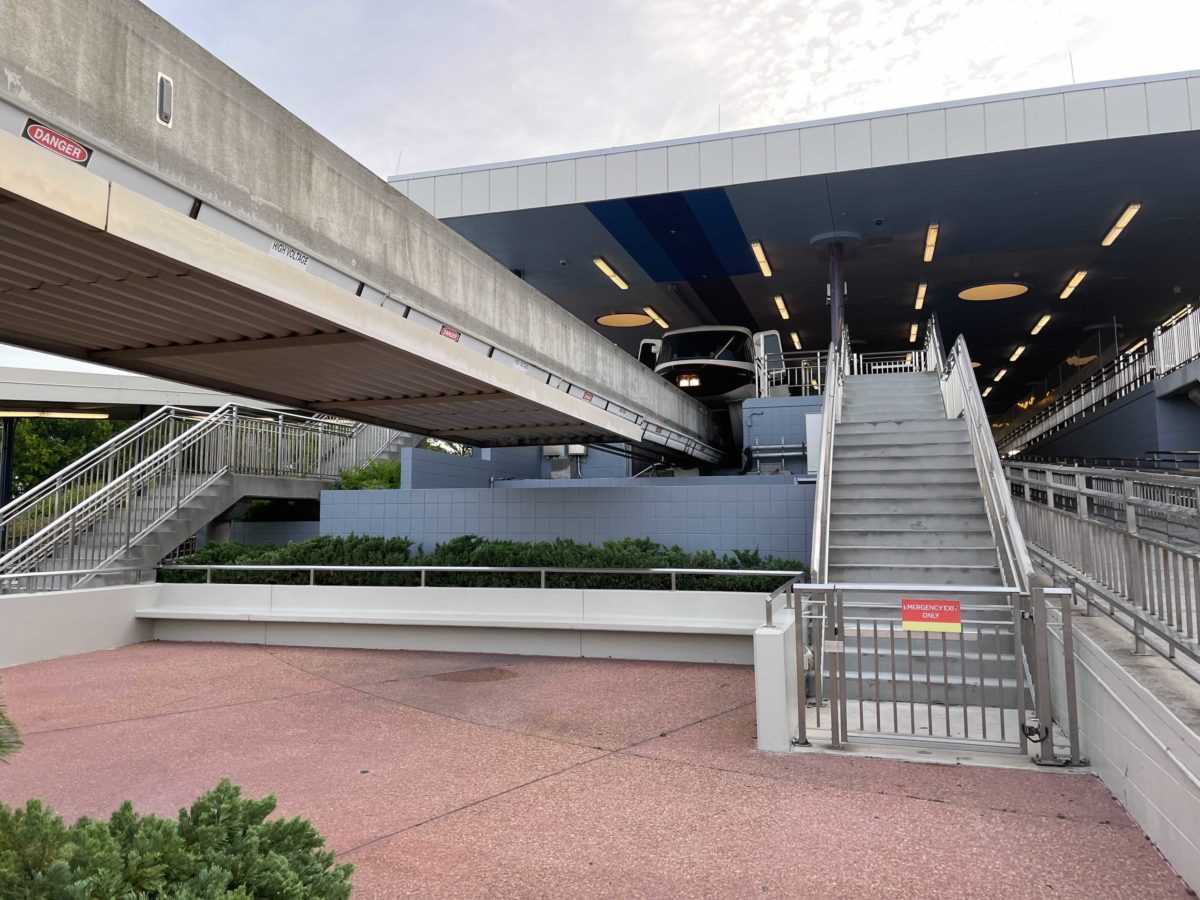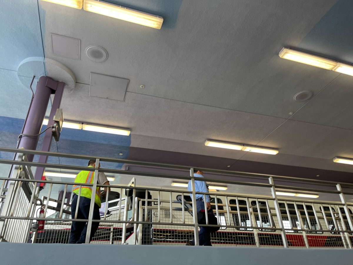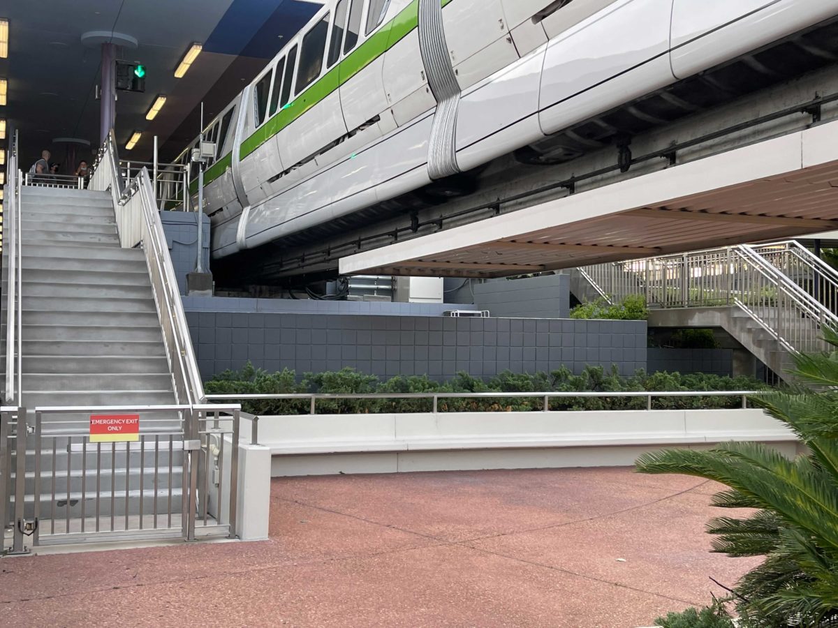 Much of the station has a new gray color, as seen beneath the monorail beam. The same color can be found on the loading platforms.