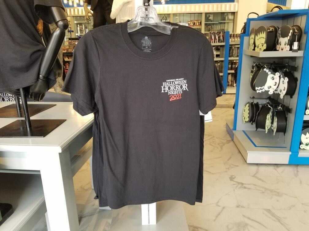 The front shows the Halloween Horror Nights logo and the year 2021 on the right-hand side of the chest.