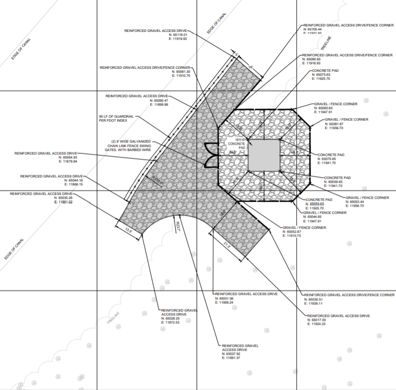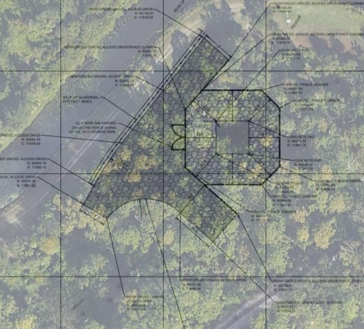 The blueprints of C-104 show new reinforced gravel access drives and a 16’x16′ concrete pad, which will be the location for the launch tube. The sites are surrounded by chain-link fencing with barbed wire. These features are found in the plans for all four sites.