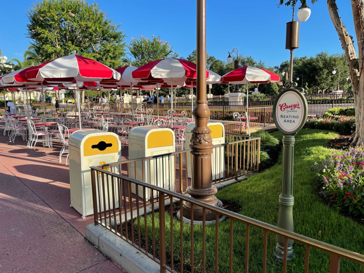Though a reopening date has not been announced, it seems that we are inching closer to Casey’s Corner reopening at Magic Kingdom. The hot dog quick-service restaurant has been closed for a year for physical distancing. The restaurant’s interior has been set up to welcome guests back and now the sign for the exterior seating area has been uncovered.