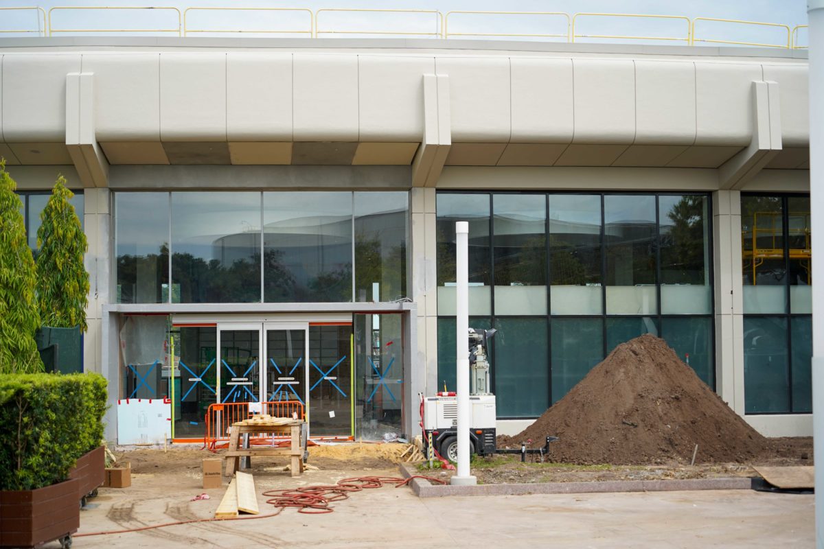 Just inside the entrance, work is ongoing for a wall display. A lift is in place for crew members for ease of access. Above the doors, you can see one of the large CommuniCore-style light fixtures.