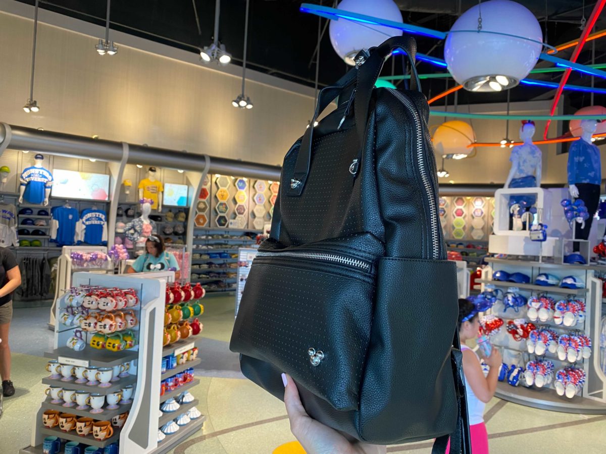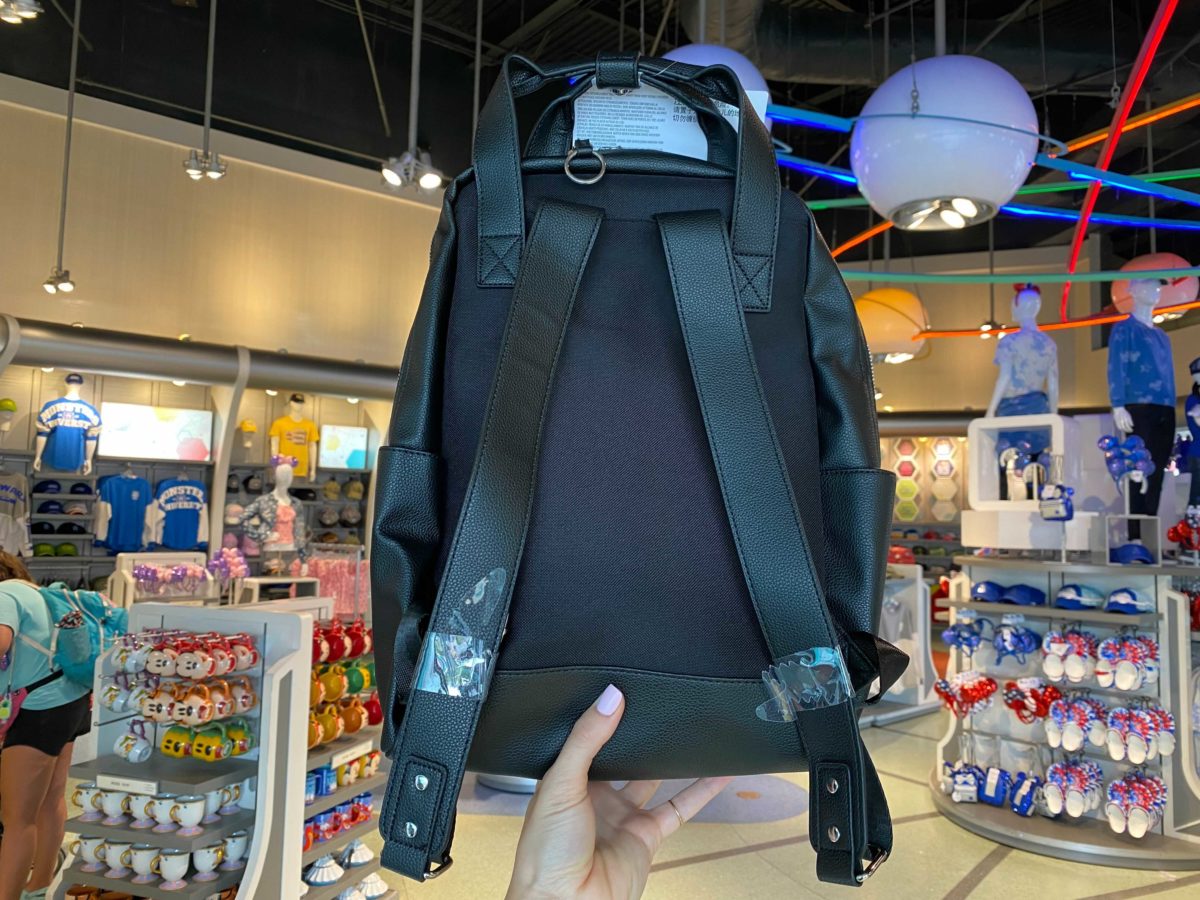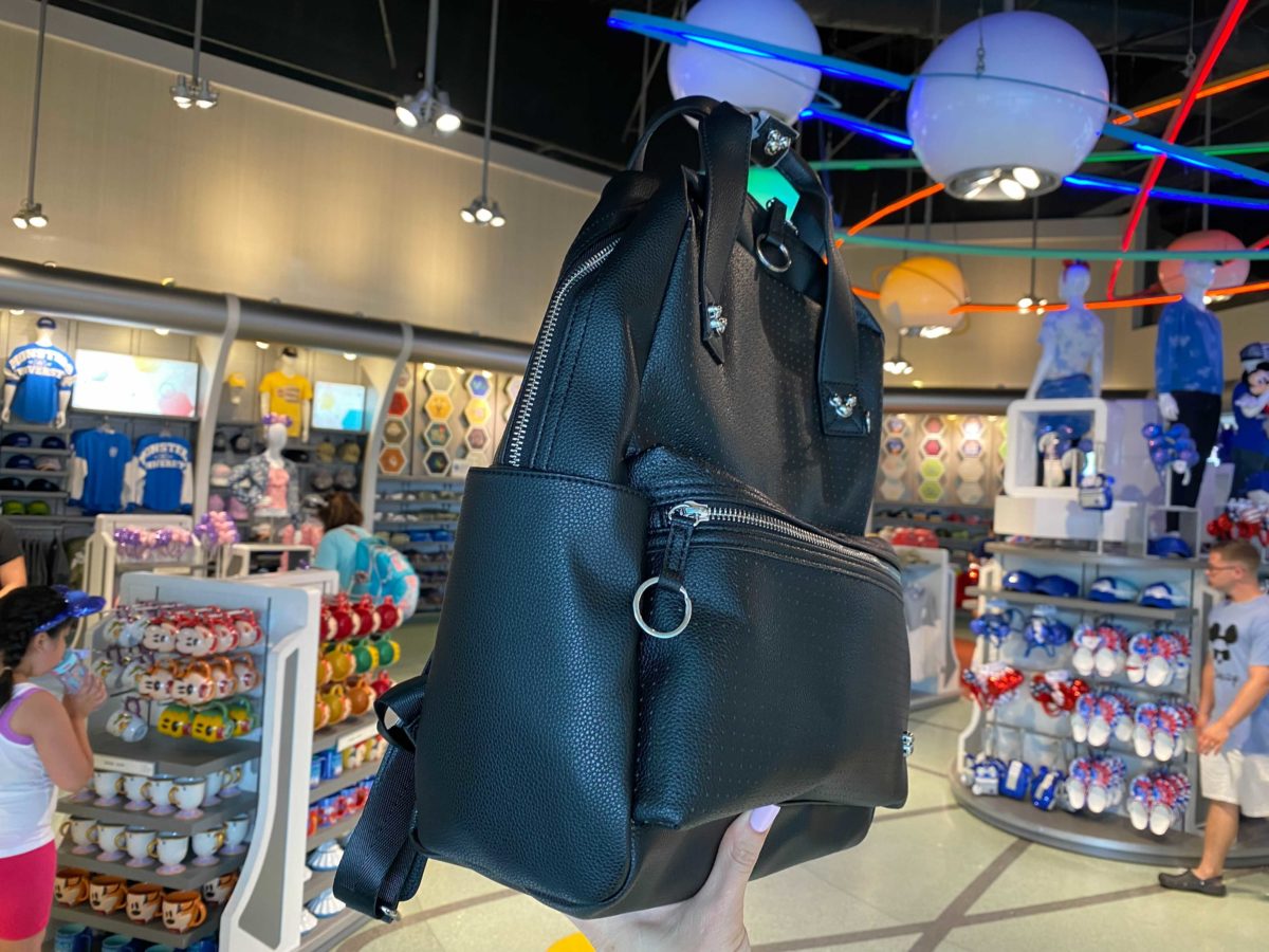 Also made of faux lather, the bag features four metal Mickey Mouse icons on the front side.