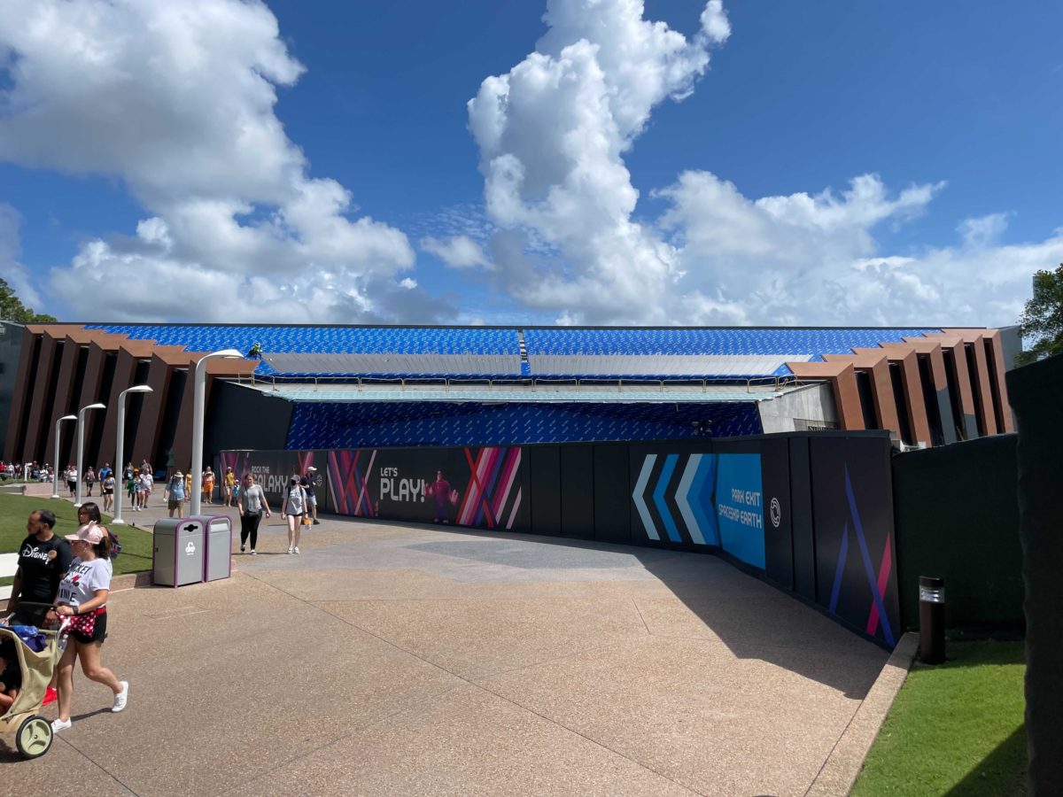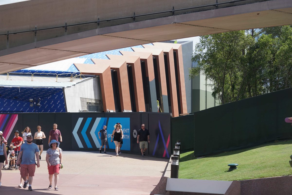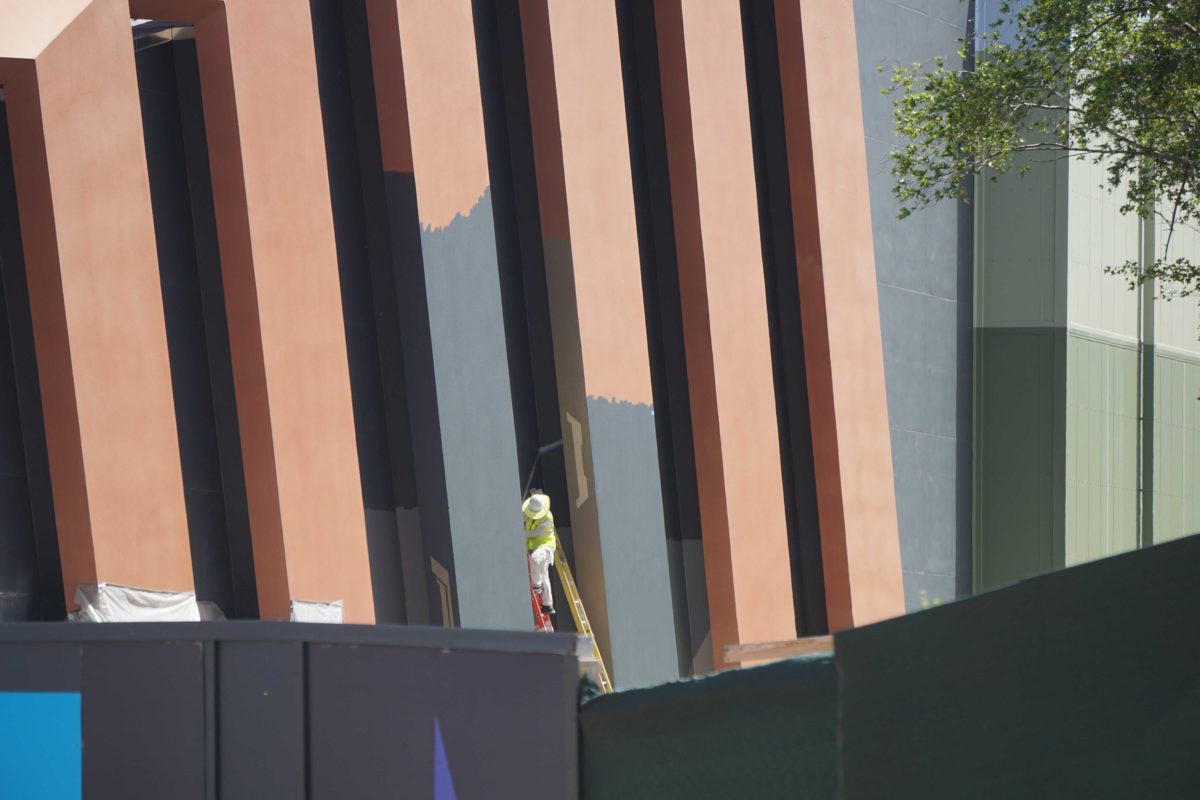 Almost two years ago, as work was really just starting on Guardians of the Galaxy – Cosmic Rewind at EPCOT, the classic pillars on either side of the Universe of Energy pavilion were painted a dark orange in preparation for the new attraction. Now, for some reason, they’re being repainted again in gray, with alien or futuristic markings accenting them.