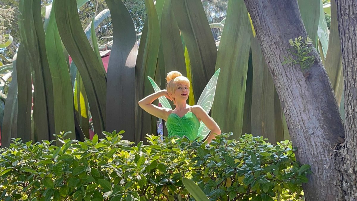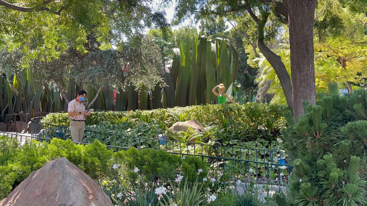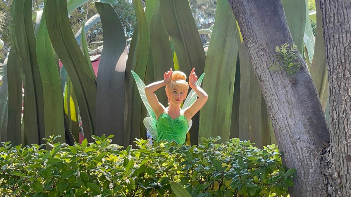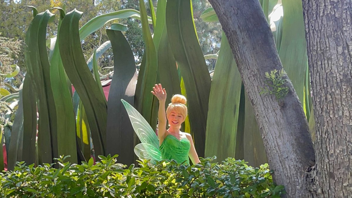 Tinker Bell is greeting guests once again near her Pixie Hollow home in Disneyland Park. For safety, she is still making appearances at a distance, but guests can take her photo and talk to her.