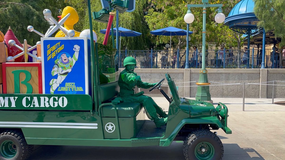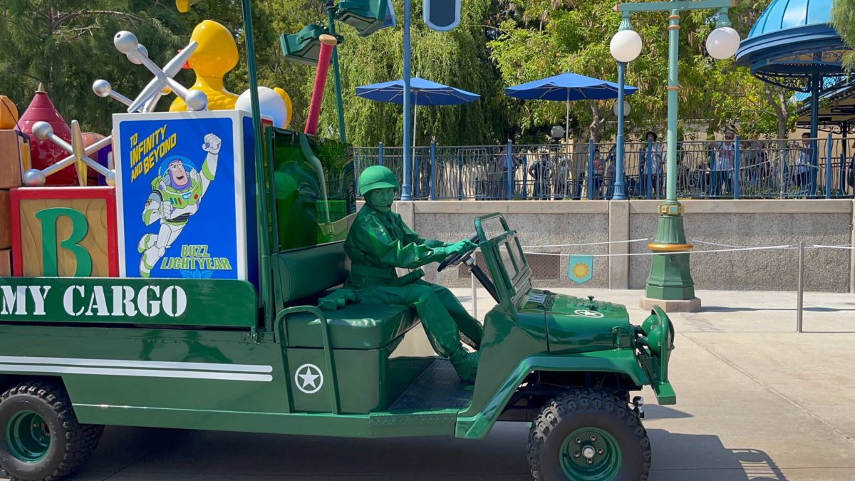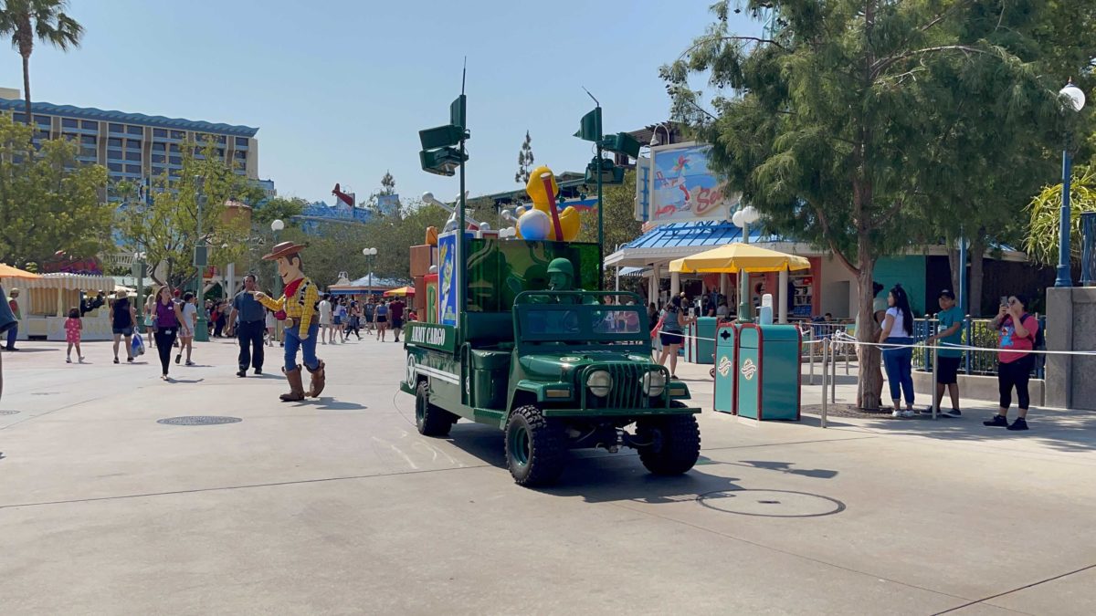 A “Toy Story” cavalcade has debuted on the streets of Disney California Adventure. This short cavalcade features Woody, Jessie, and a toy soldier driving some “army cargo.”