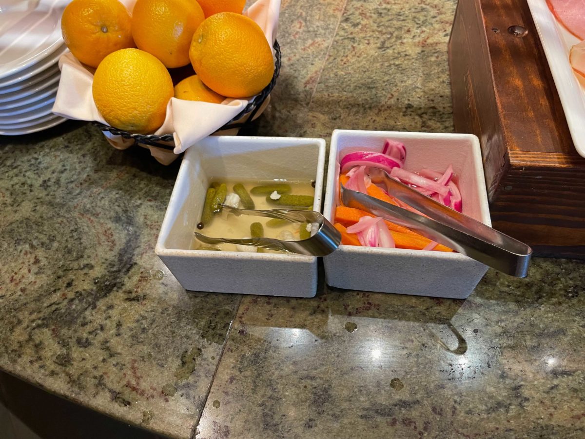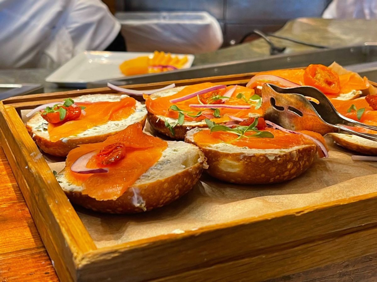 One of the more unique offerings is the mini smoked salmon bagel, with roasted tomato, red onion, capers, and spread.
