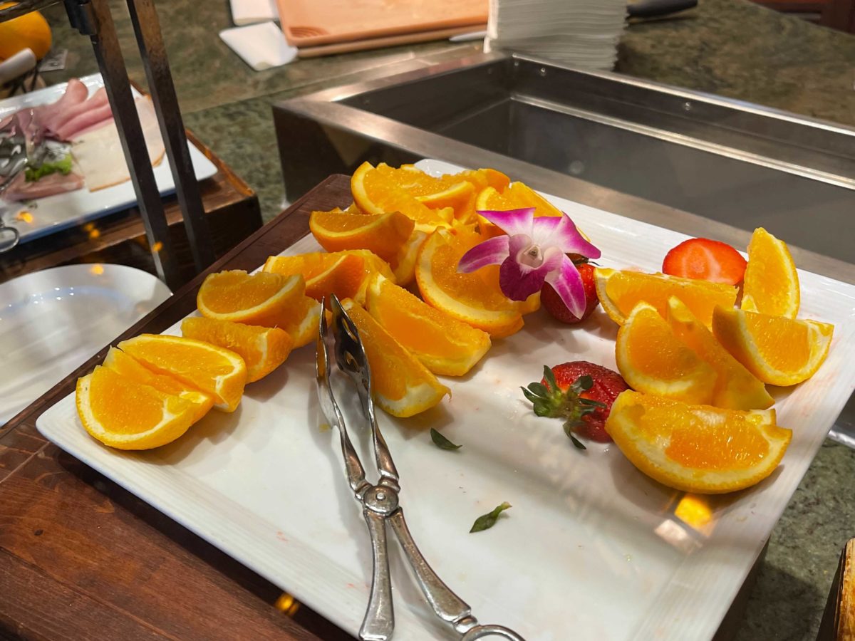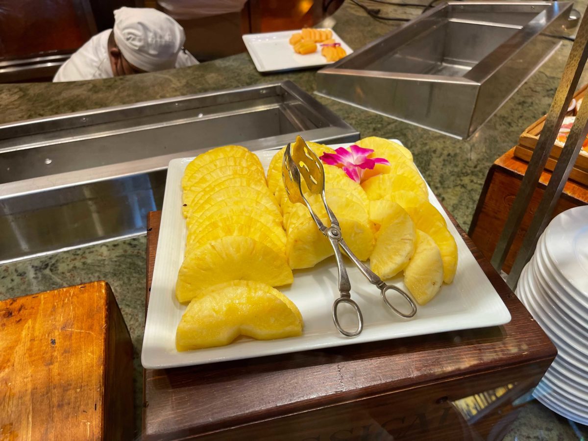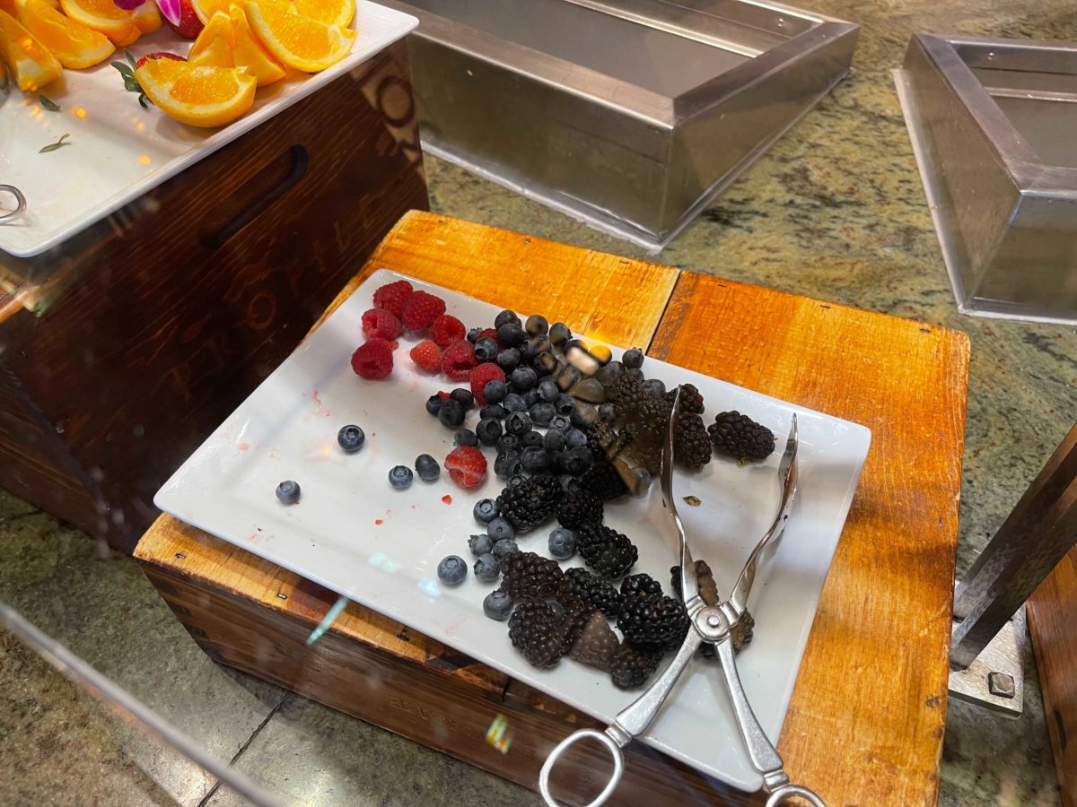 There are trays of seasonal sliced fruits and berries, including pineapple, blueberries, strawberries, and oranges.