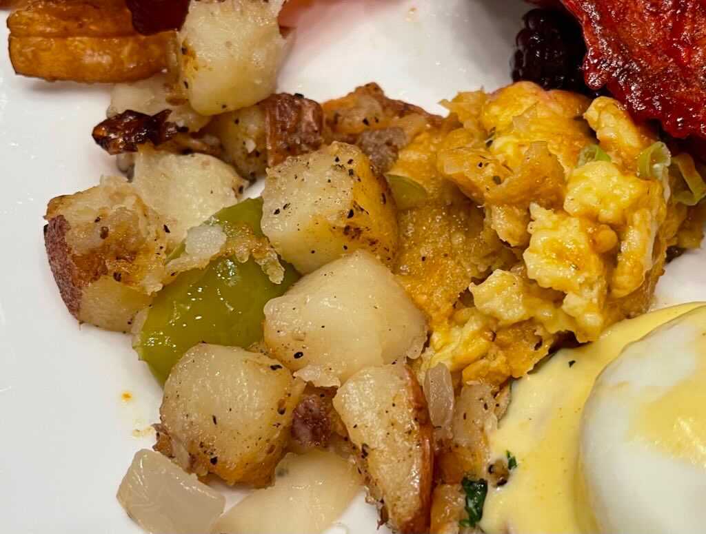 The assorted fruit and pastries are all delicious. The eggs benedict was amazing. The eggs were super fluffy with great flavor.