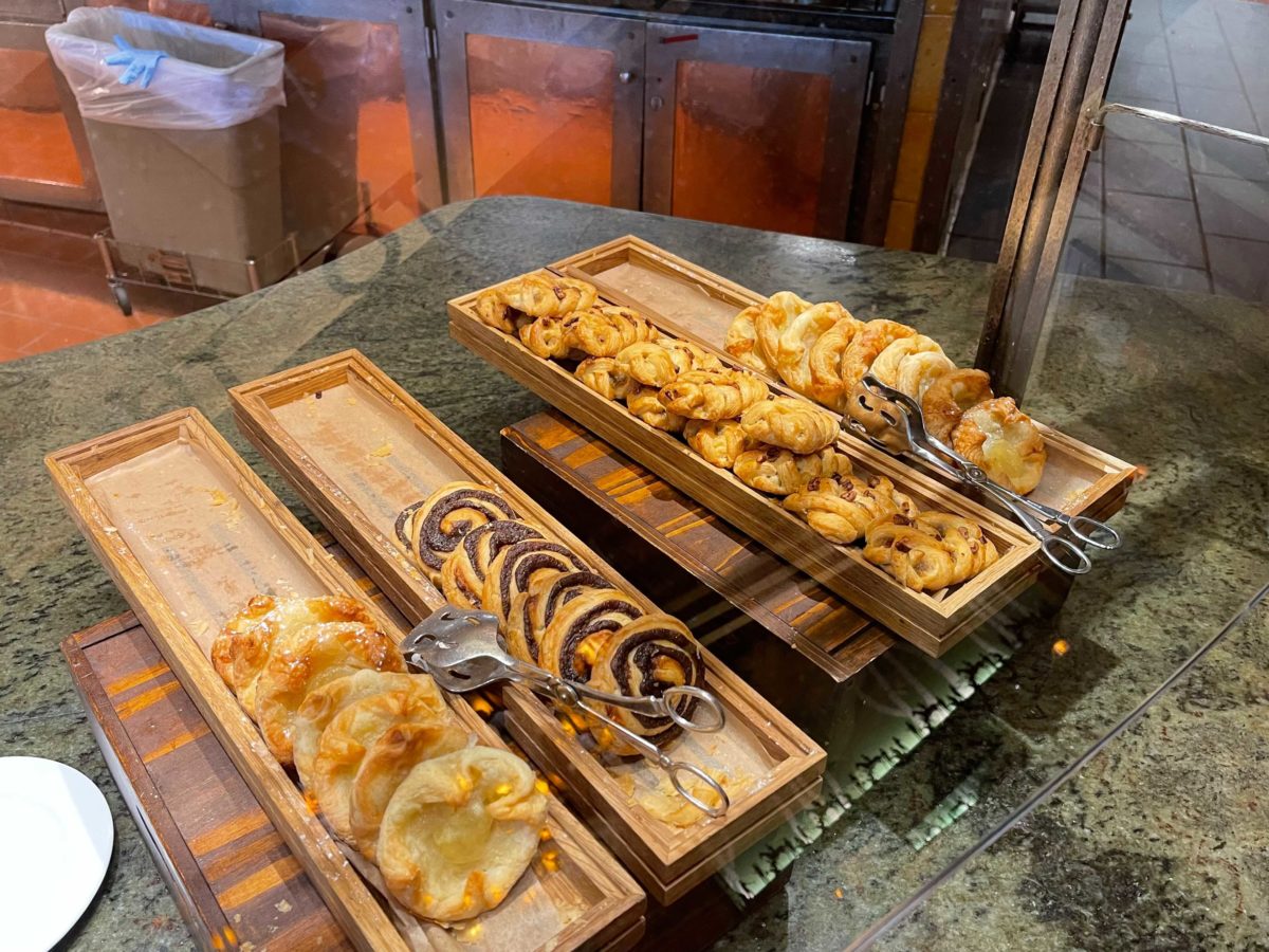 The assorted mini pastries include croissants, muffins, and danishes.