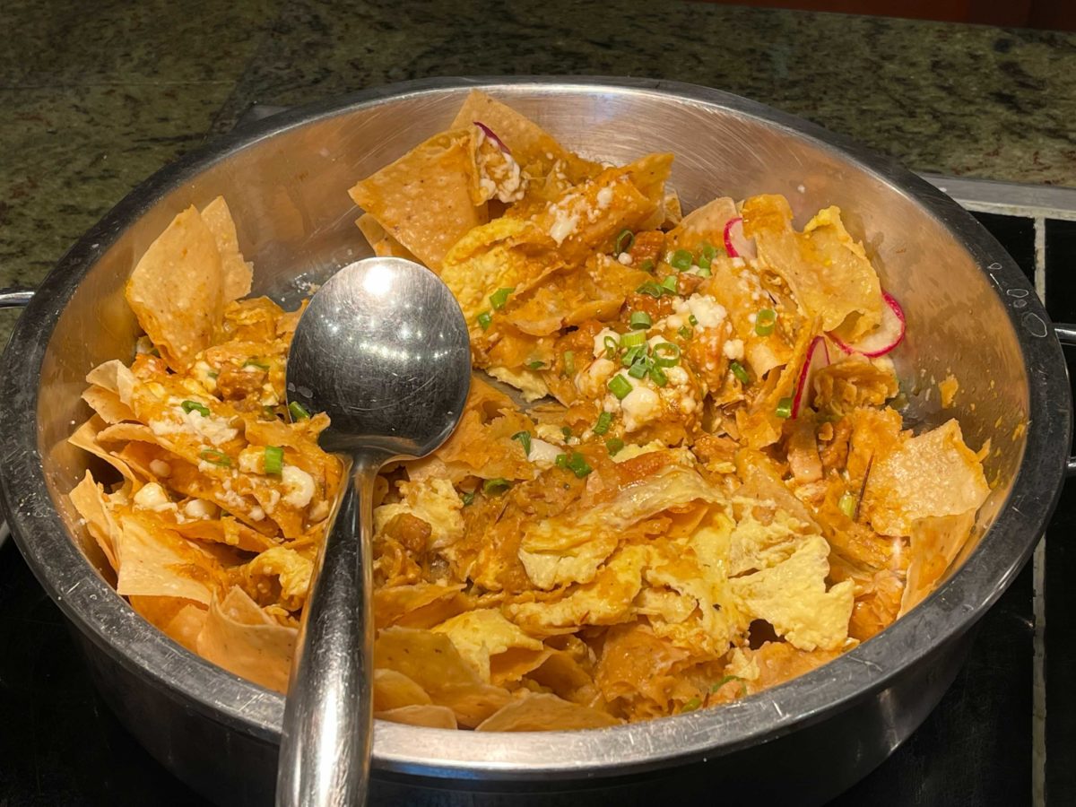 The chilaquiles include pork belly, tomatillo salsa, queso fresco, scallions, and radishes.