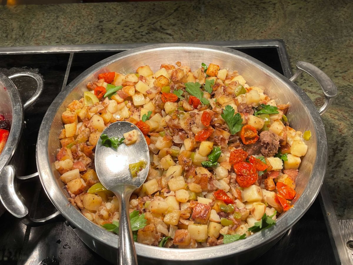 The breakfast potatoes come with crumbled Impossible meat, bell peppers, onions, roasted tomatoes, and parsley leaves.