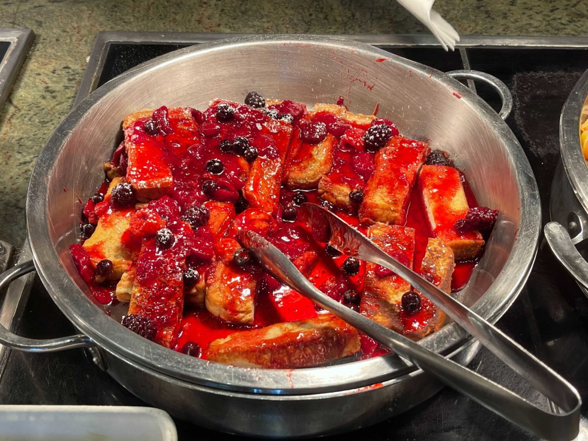 The french toast casserole has macerated berries and powdered sugar.