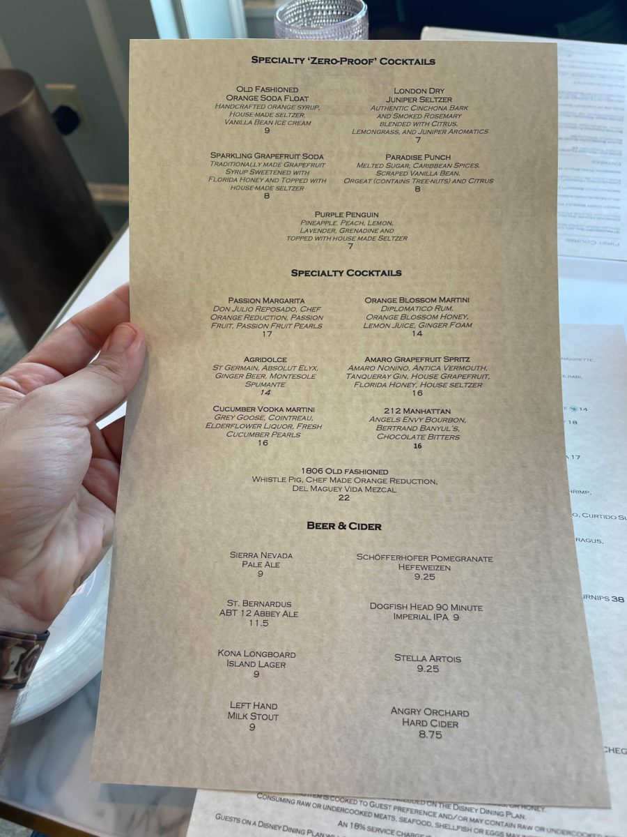 This was the best drink of the bunch. Perhaps the best Manhattan on Walt Disney World property. Whistle Pig Whiskey, Del Maguey Vida Mezcal, and the star of the show — the chef-made orange reduction — made the most elegant Manhattan on property. With aromatic orange up front and smooth vanilla notes at the end, we highly recommend this.