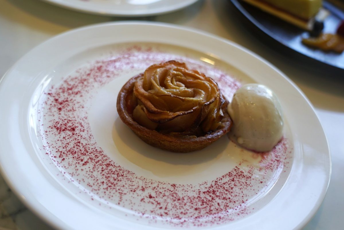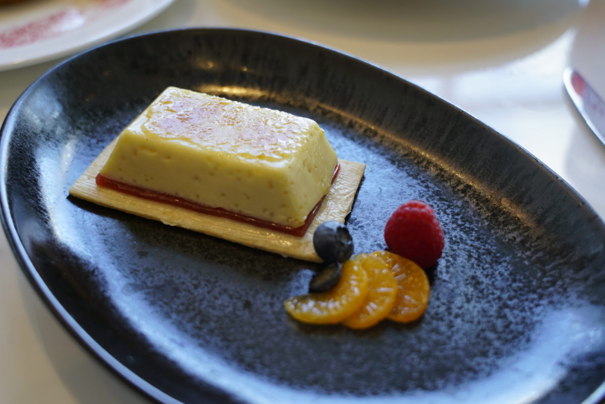 The most impressive looking of all the desserts! The touch of gold leaf on top really set the tone for this dessert service. The powdered cocoa on the plate is the same pattern as the metal decoration which separates the 2 dining rooms — a thoughtful touch! This was a decadent indulgence with a thick layer of dark chocolate ganache. We enjoyed the combination with the morello cherries but could’ve used a tiny bit more cherries. The best chocolate dessert we’ve had in a long time.