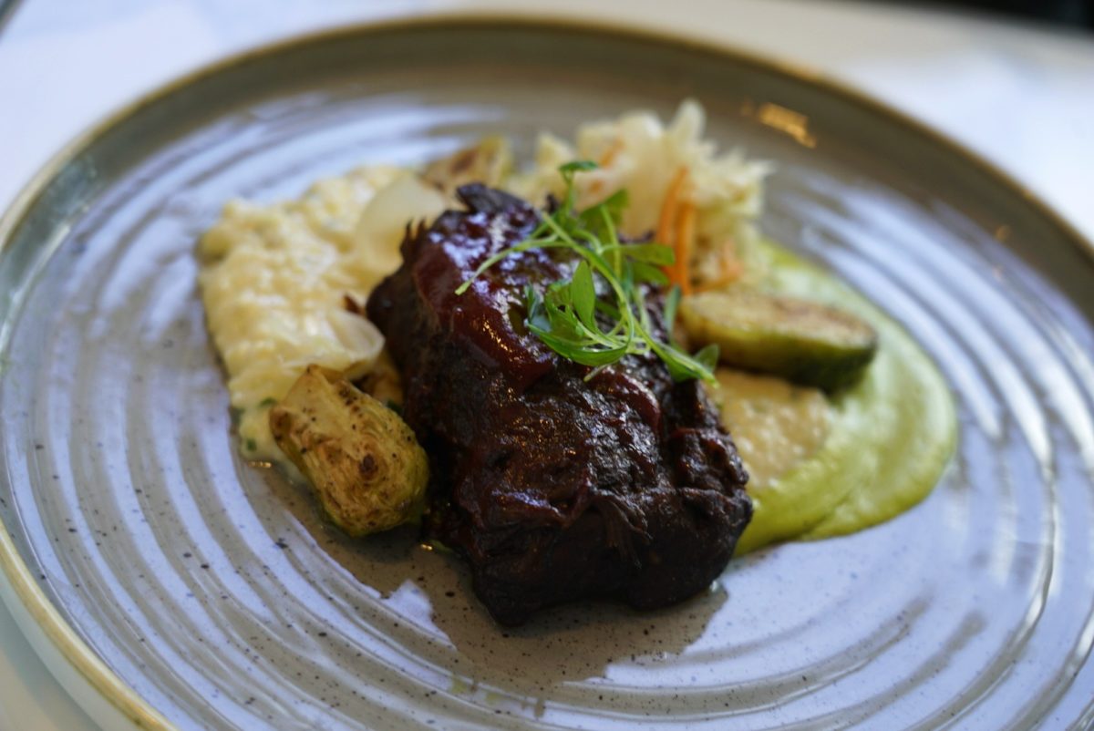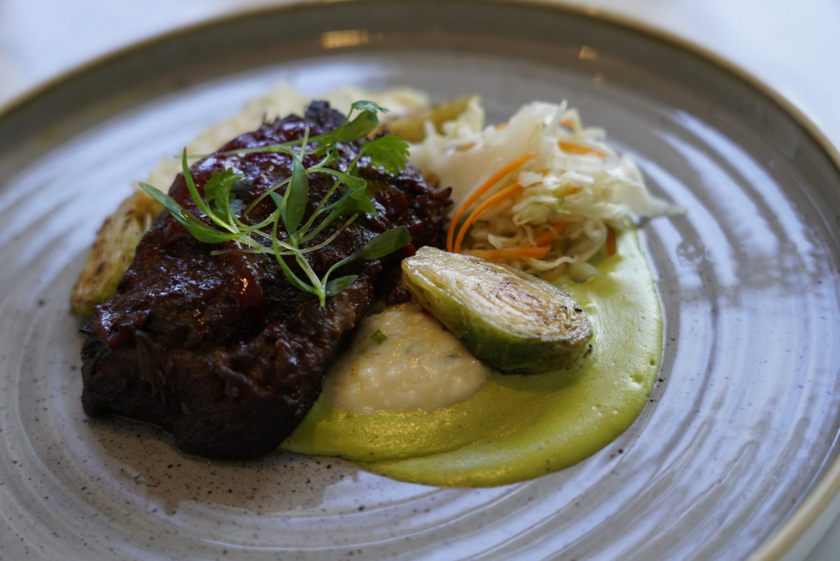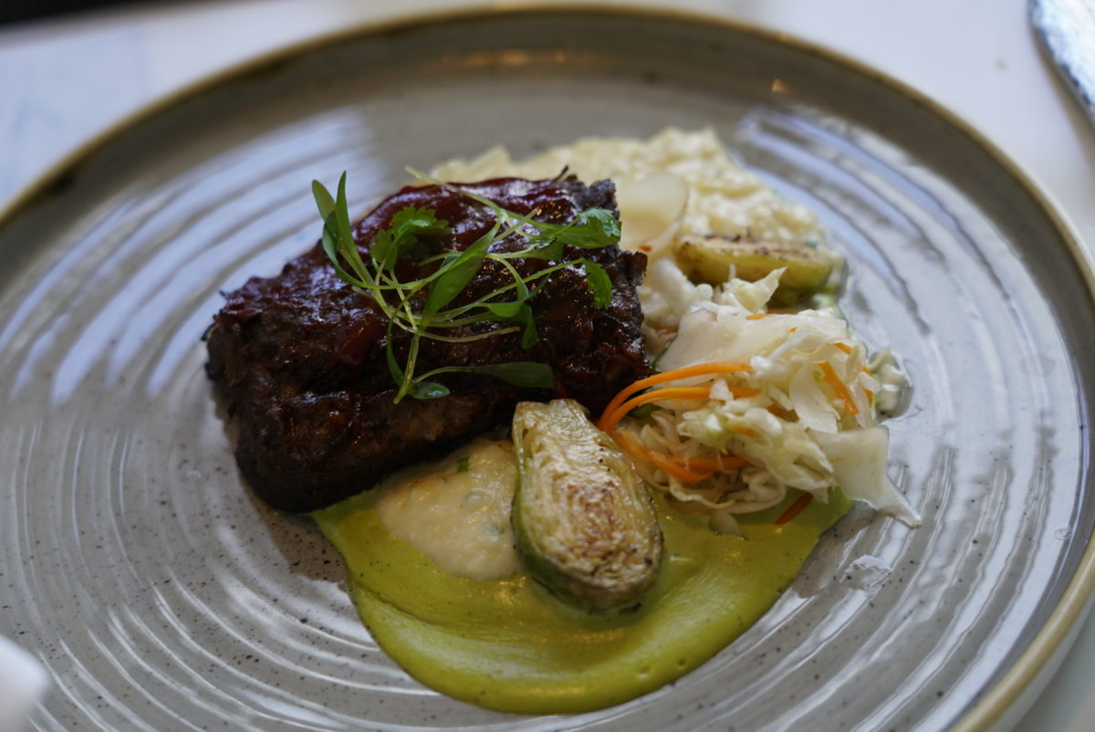 These were the most tender and sumptuous short ribs we have had at Walt Disney World. We didn’t get much guava from the barbecue sauce, but it was sweet nonetheless. The roasted poblano sauce had a tiny hint of heat, not to overwhelm the typical tourist but still give a hint of kick on the backend for flavor. This contrasted with the saltiness of the aged cheddar creamy grits, which were so creamy that they were almost like a well-mashed potato. The Brussel sprouts were crispy and bright, but the Curtido slaw was forgettable. Overall, an outstanding dish!