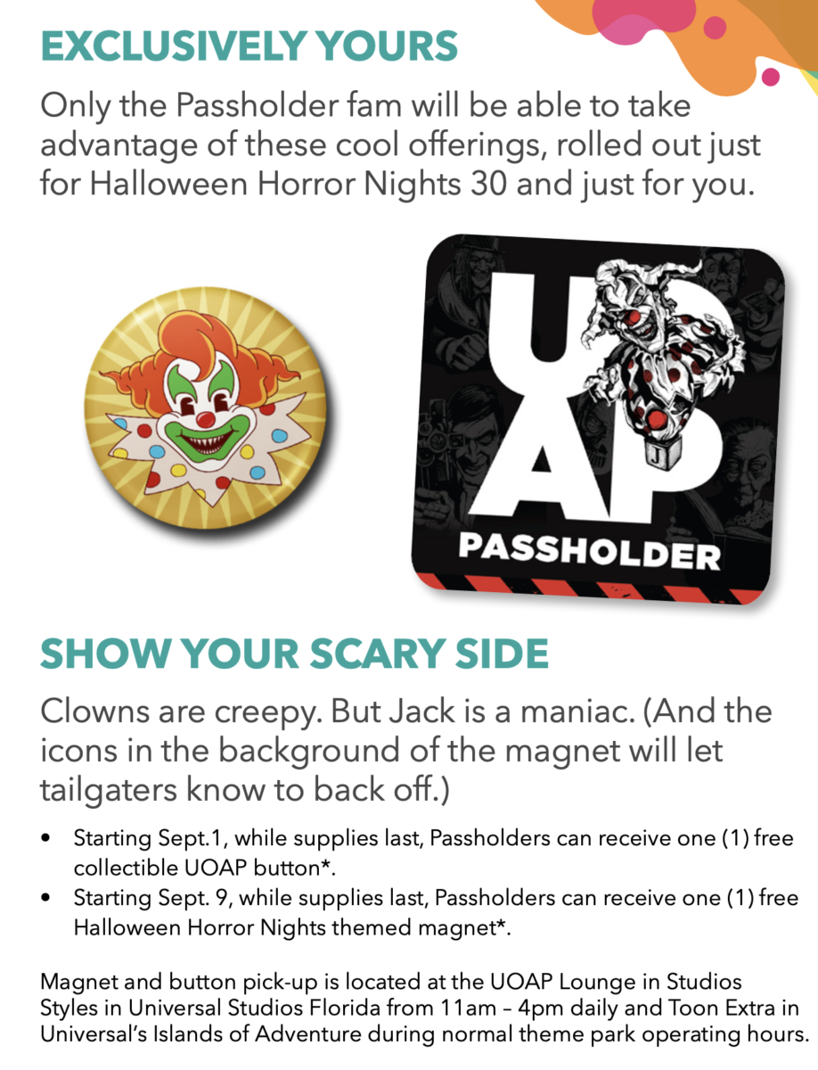 In the latest UOAP Passport, Universal Orlando Resort has revealed that Passholders are entitled to a complimentary Jack the Clown button (beginning September 1st) and Jack UOAP magnet (beginning September 9th). Passholders can obtain their goodies at the UOAP Lounge at Universal Studios Florida from 11 AM to 4 PM or at Toon Extra in Universal’s Islands of Adventure during operating hours.