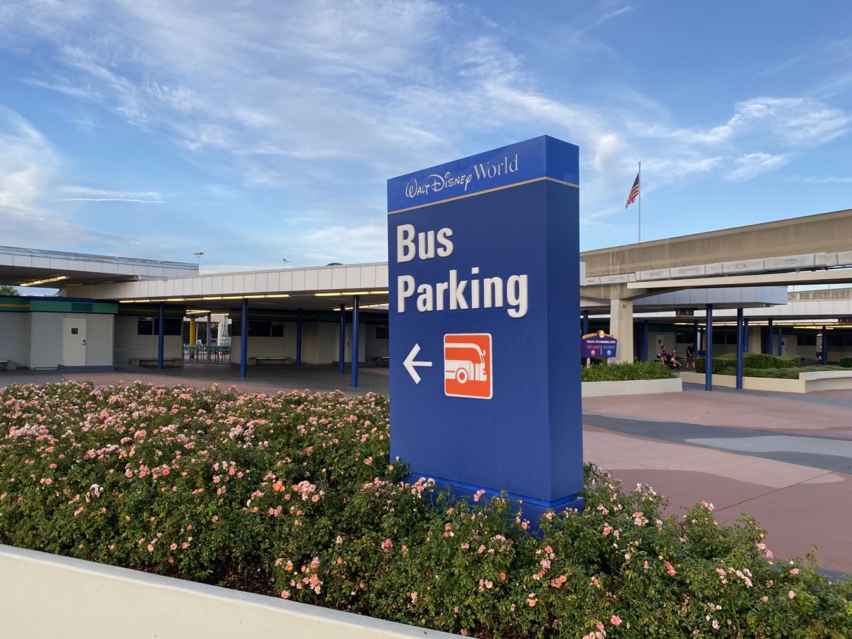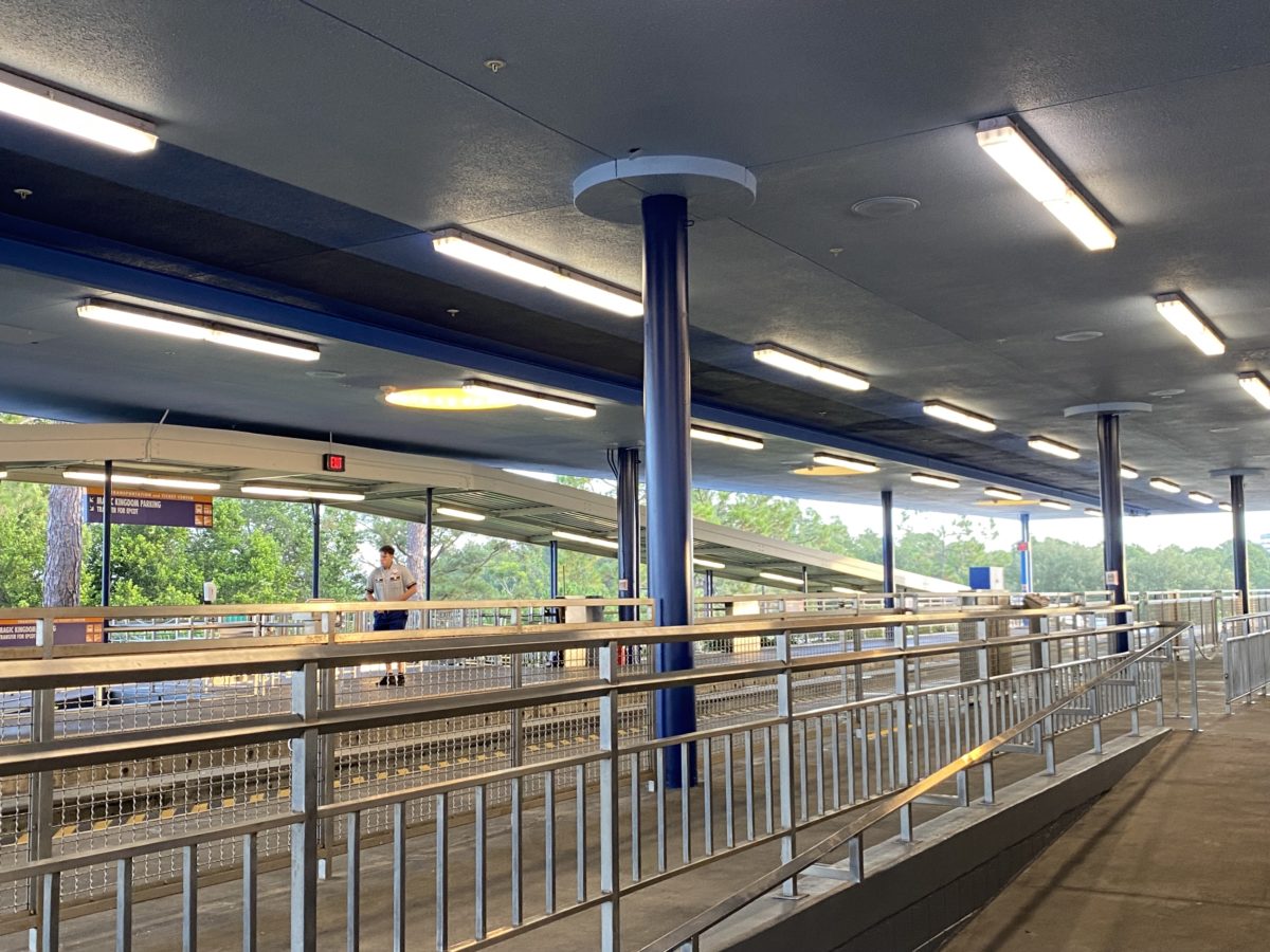 Starting our day off with a stop at the Transportation and Ticket Center before boarding the monorail to Magic Kingdom, more “royal” blue paint has been added to poles around the ticket booths. A new bus sign greets you as you head back into the parking lot. We also have a first look at what each booth will look like in their new golden anniversary attire!